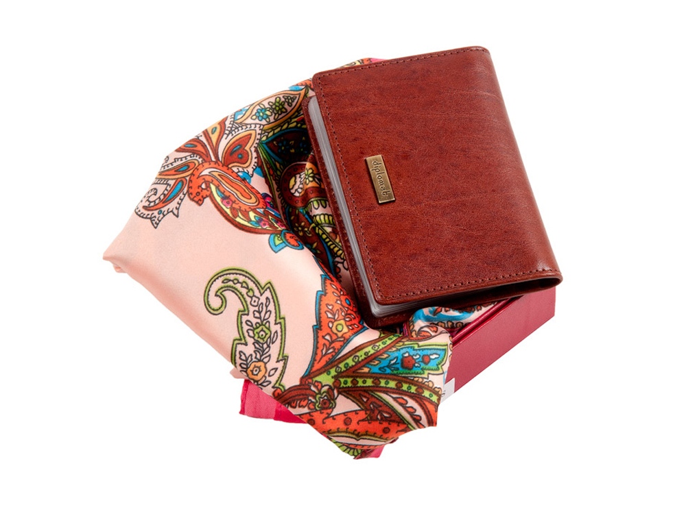 Прекрасный подарок, подходящий к любому празднику. Визитница сделана из нежной на ощупь натуральной кожи светло-коричневого цвета, внутри расположены удобные прозрачные кармашки для визиток и боковые отделения для кредитных или скидочных карточек. Платок нежного розового цвета на 70% состоит из шёлка. За счёт женственного цвета и классического цветочного орнамента этот аксессуар станет изюминкой любого образа. Подарок идёт в комплекте с подарочной бордовой коробкой.