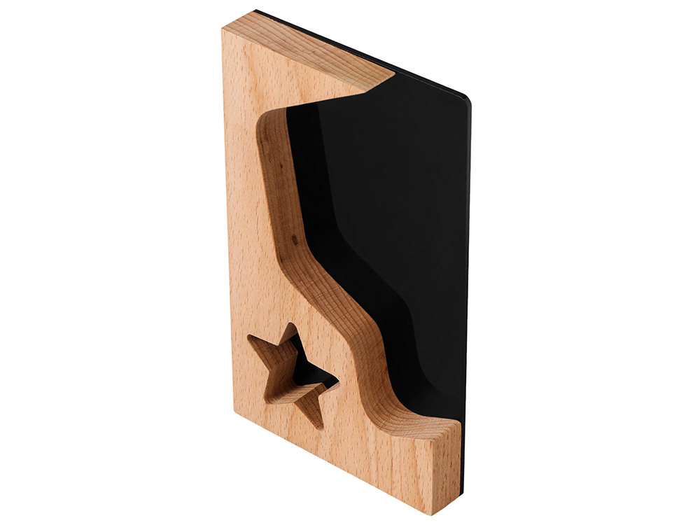 Красивая и современная награда для главных звезд любой компании. Черный акрил добавляет контраста рамке из бука, логотип или наградную надпись можно выгравировать на деревянной части или сделать уникальный дизайн, благодаря полной запечатке акрила методом УФ-печати.