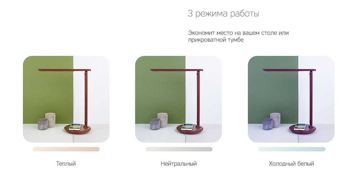 Режимы работы: три цветовые температуры: холодный белый, нейтральный белый и теплый белый