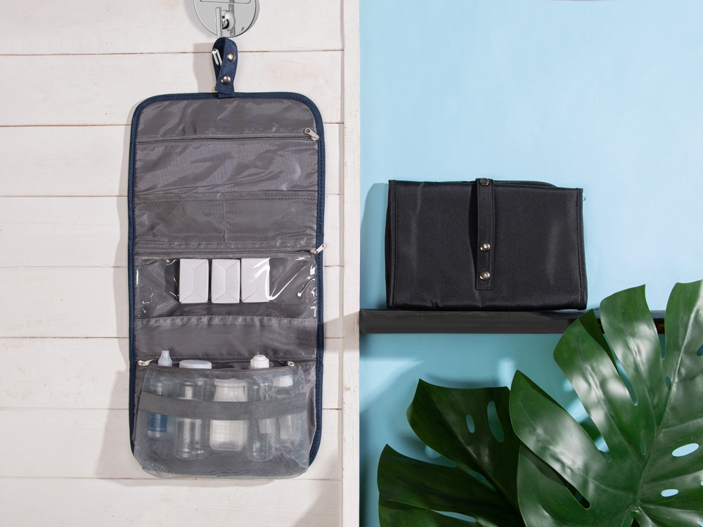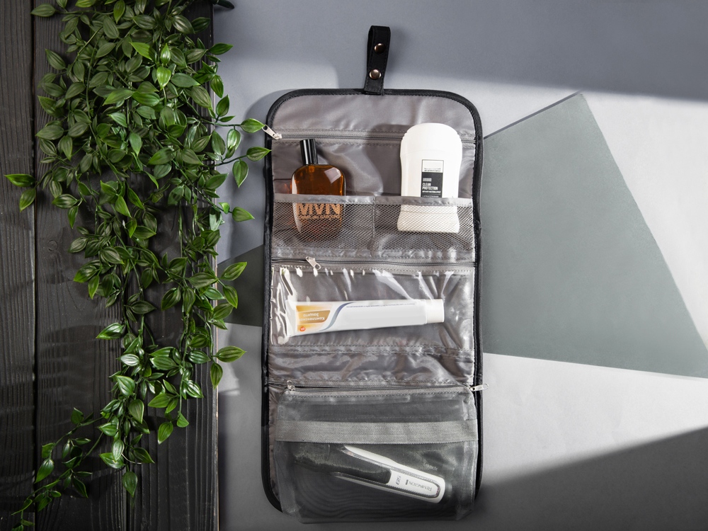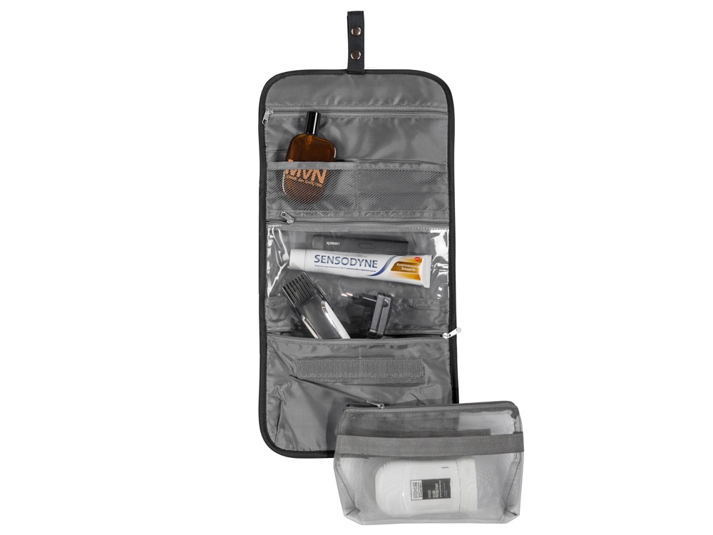 Органайзер состоит из карманов на молнии, карманов-сеток, прозрачного моющегося кармана на молнии, в который можно поместить флаконы с жидкостью — даже если емкость разгерметизируется, карман легко очистить под струей воды.