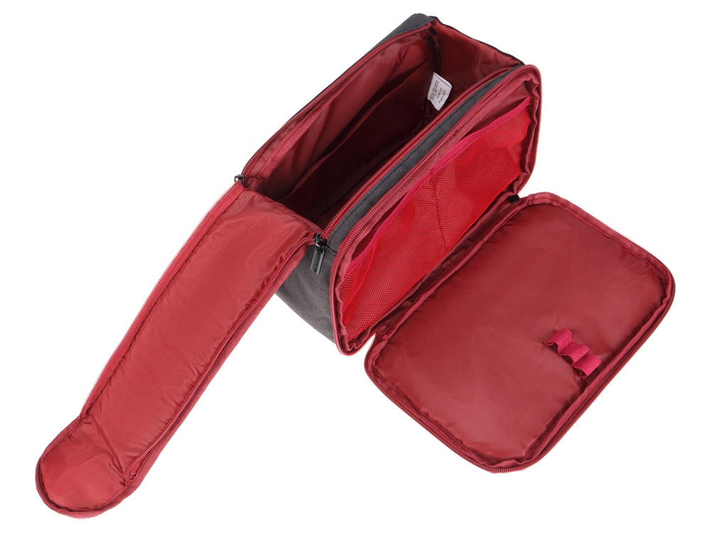 Несессер выполнен в прямоугольной форме, центральное отделение имеет клапан на молнии с двух сторон и магнитной кнопкой на конце. На внешней стороне расположено дополнительное отделение на молнии и включает в себя два сетчатых кармана и три эластичных держателя для мелких предметов.