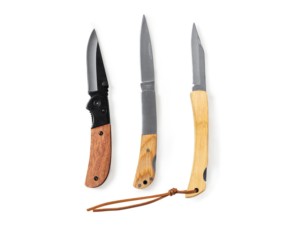 Нож из нержавеющей стали с черным лезвием и рукояткой из натуральной древесины. Идеальный нож для похода. Нож оснащен системой безопасности.