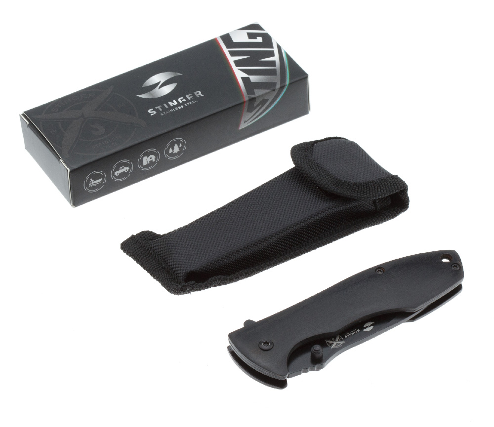 Нож складной Stinger, 80 мм, (чёрный), материал рукояти: сталь/дерево пакка (чёрный) можно заказать в нашей компании по самой доступной цене от 1 010 рублей.