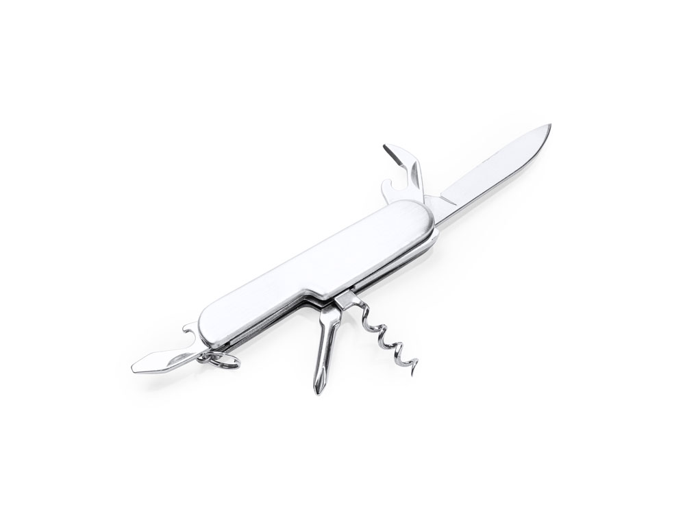 Мультифункциональный нож из нержавеющей стали с 6 функциями: нож, открывалка для бутылок, консервный нож, штопор, отвертка и кольцо для ключей.