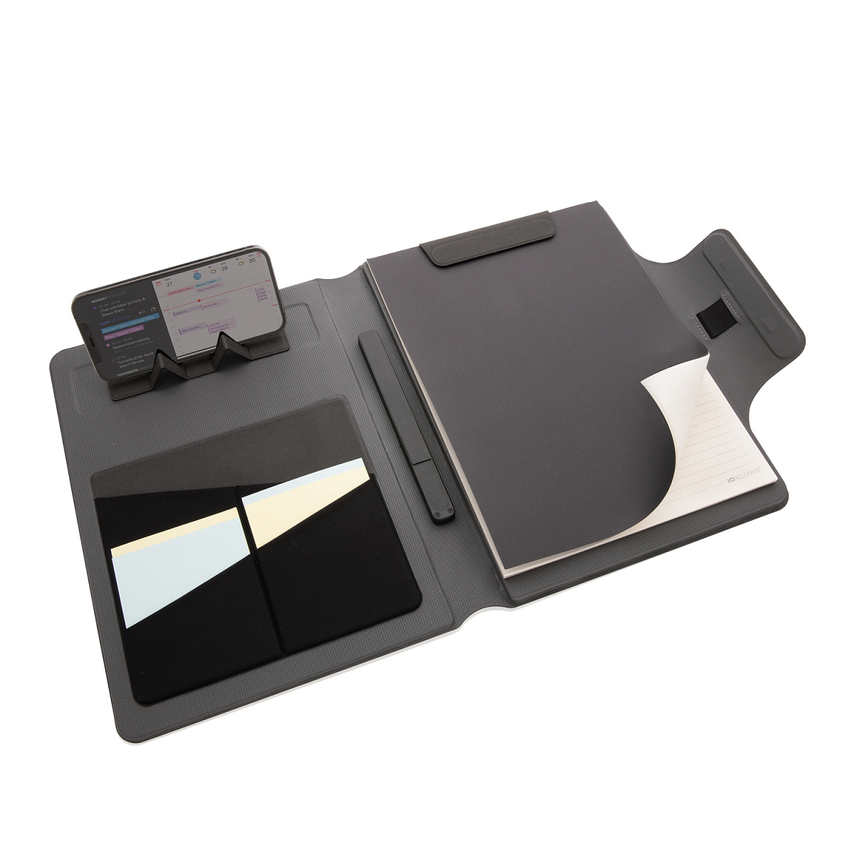 Стильный органайзер формата А4 оснащен аккумулятором на 8000 мАч и беспроводным магнитным зарядным устройством 10 Вт. Теперь заряжать смартфон стало намного быстрее и удобнее. Магниты позволят смартфону (iPhone 12 и новее) крепко и точно держаться на зарядном устройстве. Беспроводной модуль 10 Вт совместим со всеми устройствами, поддерживающими формат беспроводной зарядки QI. Вход 9 В / 2 A; беспроводной выход 9 В / 1.1 A; Type-C выход 9 В / 2 A. Органайзер содержит блокнот из 40 страниц в линейку. Плотность бумаги 80 г/м2. Органайзер снабжен карманом для смартфона и креплением для ручки. Внутри — 19 термостойких магнитов N52H для надежного крепления к смартфону. Зарегистрированный дизайн. Длина 31,5 см., ширина 24,5 см., высота 3 см., диаметр 0 см.