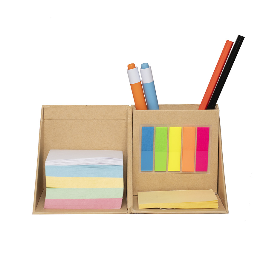 Компактный и функциональный настольный аксессуар из крафтового картона, включает в себя отделение для пишущих принадлежностей, блок бумаги для записи 7,4*7,4 см 500 л, блок бумаги для заметок с клеевым краем 7,5*5 см 50 л и набор пластиковых закладок с клеевым краем 5цв по 25 л.
