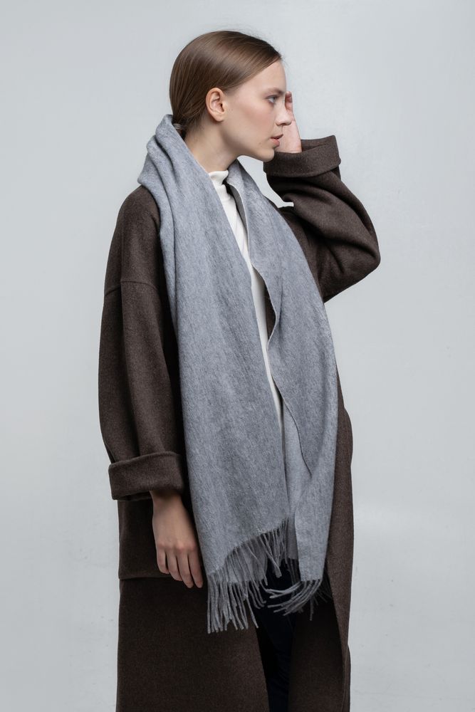 Широкий палантин с едва заметным узором плетения открывает простор фантазии — его можно использовать как шарф, головной убор или декоративный элемент для верхней одежды.