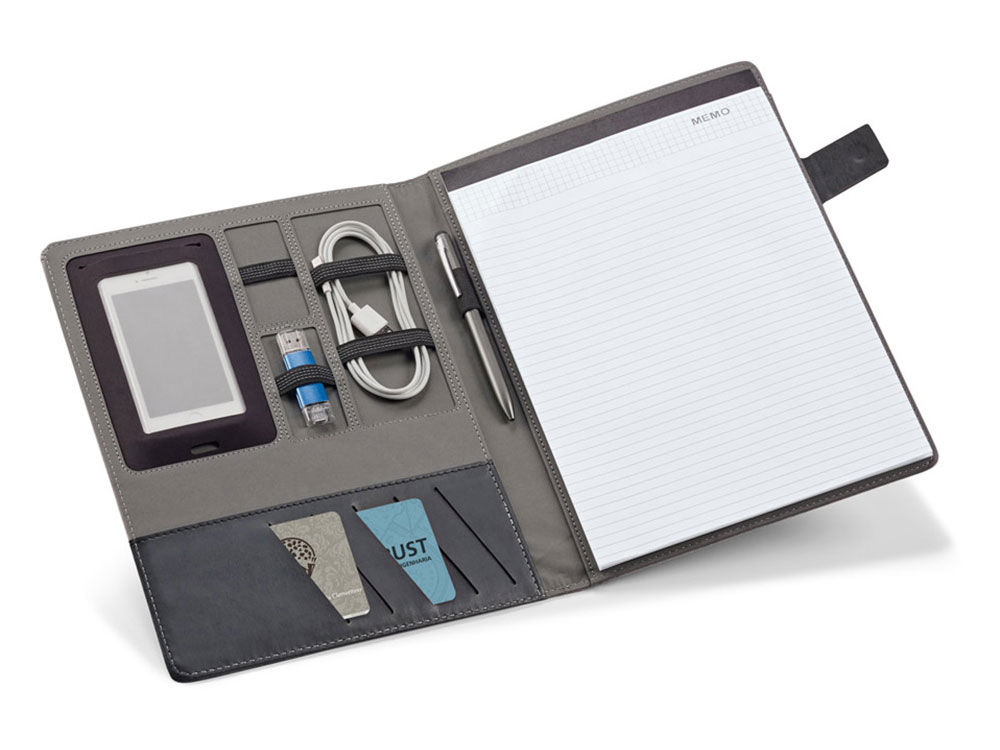 Папка A4 из искусственного льна и кожзаменителя. Имеет застежку на магните с пластинкой для персонализации. Внутри имеет блокнот из 20 листов в линейку, держатель для шариковой ручки (ручка не входит в комплект), карман для смартфона и держатели для кабелей или других принадлежностей (в комплект не входят). 233 x 310 x 18 мм | Пластина: 50 x 30 мм. Вид нанесения, рекомендуемый поставщиком: трансфер, гравировка.