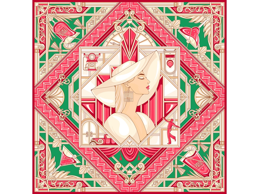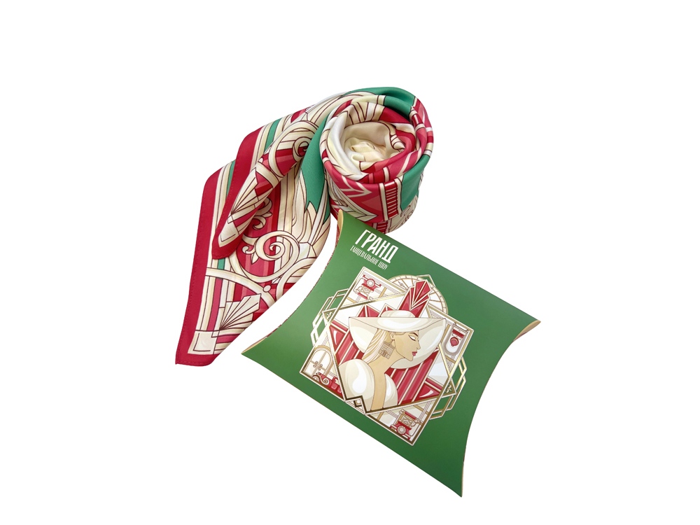 Коллекционный платок ГРАНД создан дизайнером Ниной Ручкиной специально ко дню премьеры грандиозного танцевального шоу История в отеле в лучших традициях бродвейских постановок, которое выходит впервые на российской сцене.