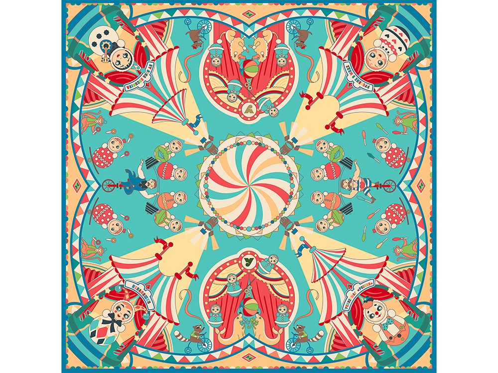 На полотне воплощена добрая атмосфера народного веселья и волшебства, где каждый рисунок напомнит о сказках, ярмарках и лубочных иллюстрациях. В центре лучится купол цирка, разноцветный словно леденец, а вокруг раскинулись нарядные шатры. В свете софитов запечатлены расписные образы игрушек, зверей, эквилибристов и силачей – уникальные и неповторимые, они образуют кружащийся танец.