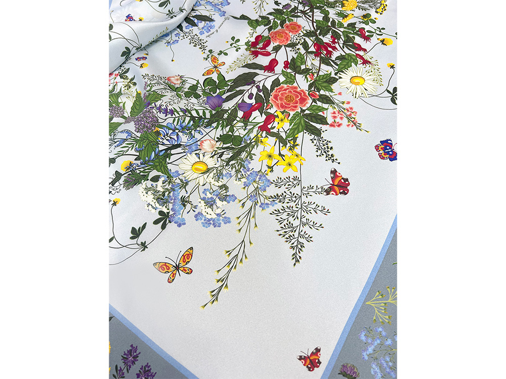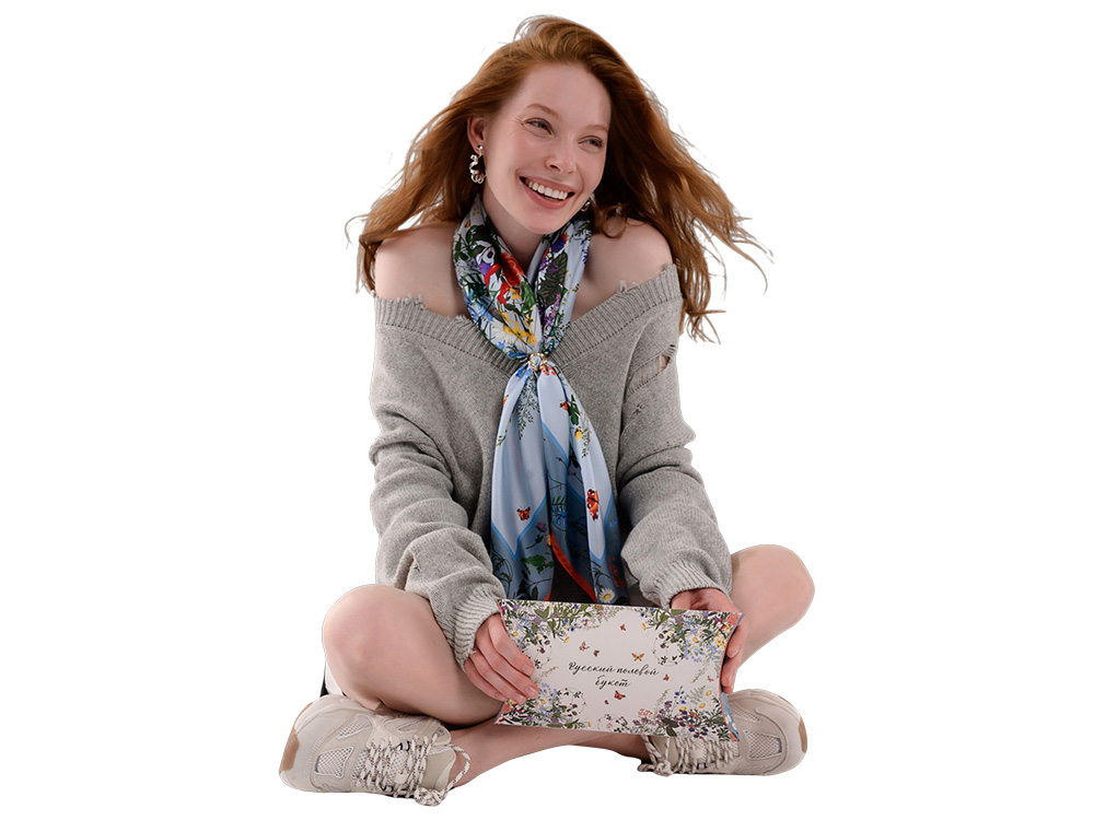 Яркое благоухающее разноцветье русского полевого букета воплощено в шелковом платке, где собраны изображения более 20 цветов и трав.