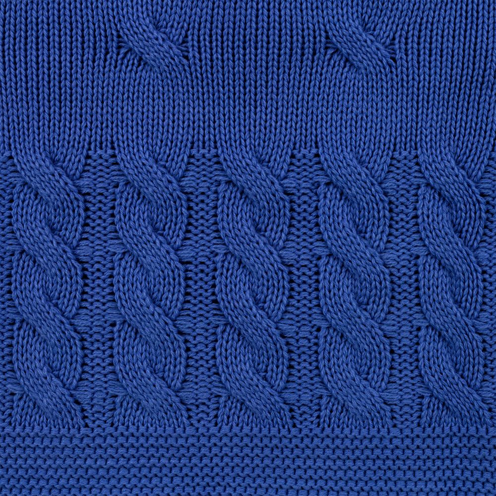 Модель: однотонный плед с фактурной вязкой, которая позволяет сделать его воздушным и объемным. Чередуя различные типы петель на гладком полотне, можно вывязать любую графику — логотип, текст, товарный знак.