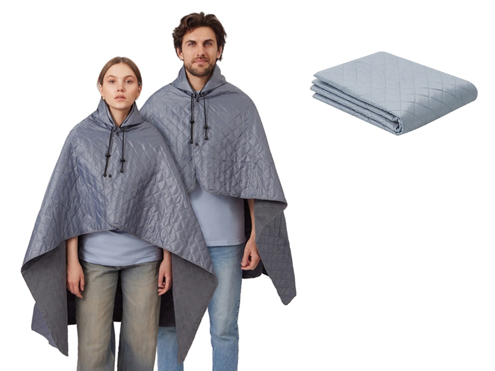 На внутренней стороне из флиса приятно и тепло сидеть, а наружная сторона из полиэстера с водоотталкивающим покрытием не позволяет пледу намокнуть или сильно испачкаться. Для больше удобства использования пледа во время дождя в комплекте идет капюшон, который фиксируется с помощью липучки. Накинув плед на плечи, застегните его на кнопки вверху и наденьте капюшон. Вы не промокните во время неожиданного дождя!