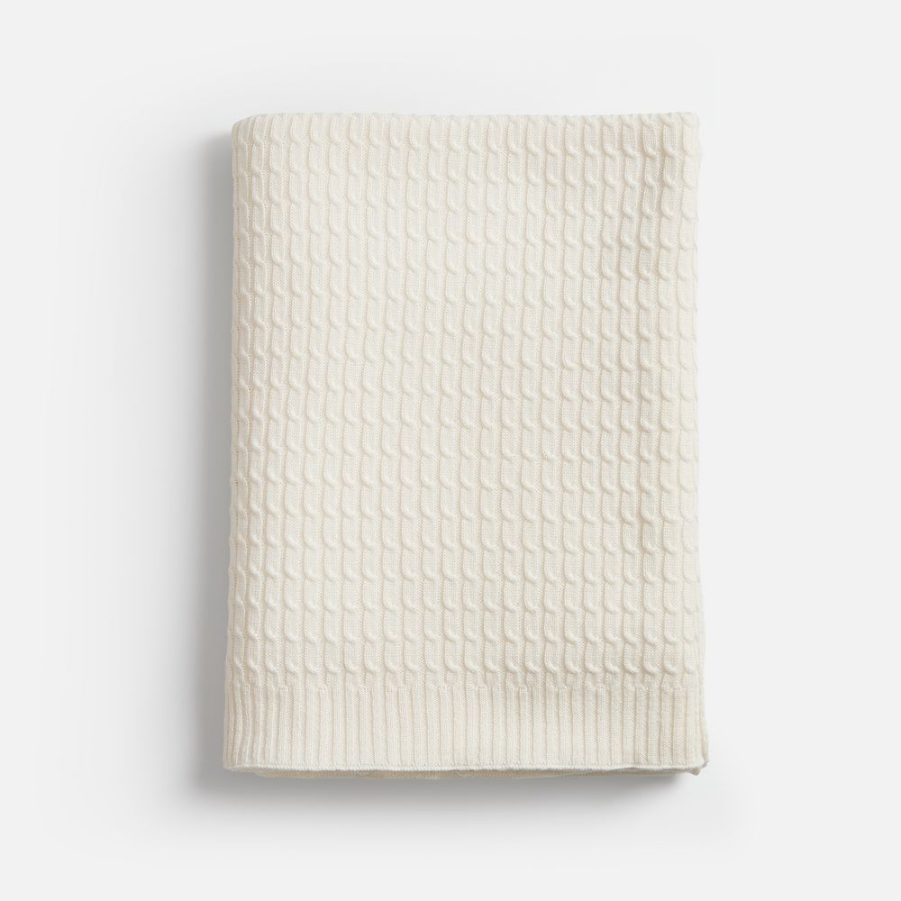 Модель: однотонный плед с фактурной вязкой, которая позволяет сделать его воздушным и объемным. Чередуя различные типы петель на гладком полотне, можно вывязать любую графику — логотип, текст, товарный знак.