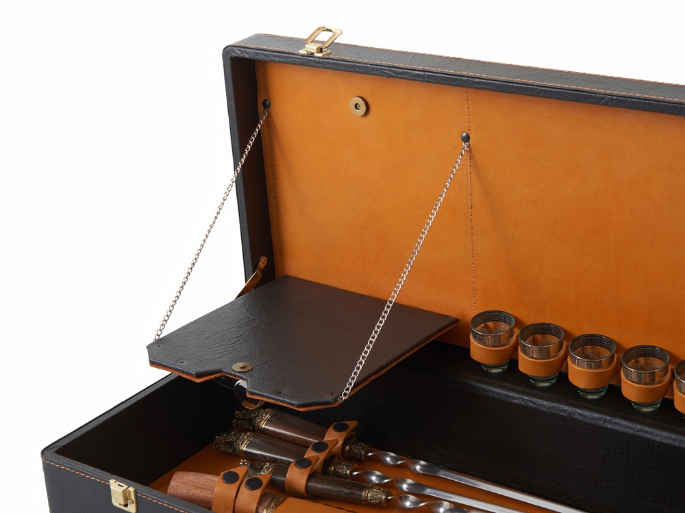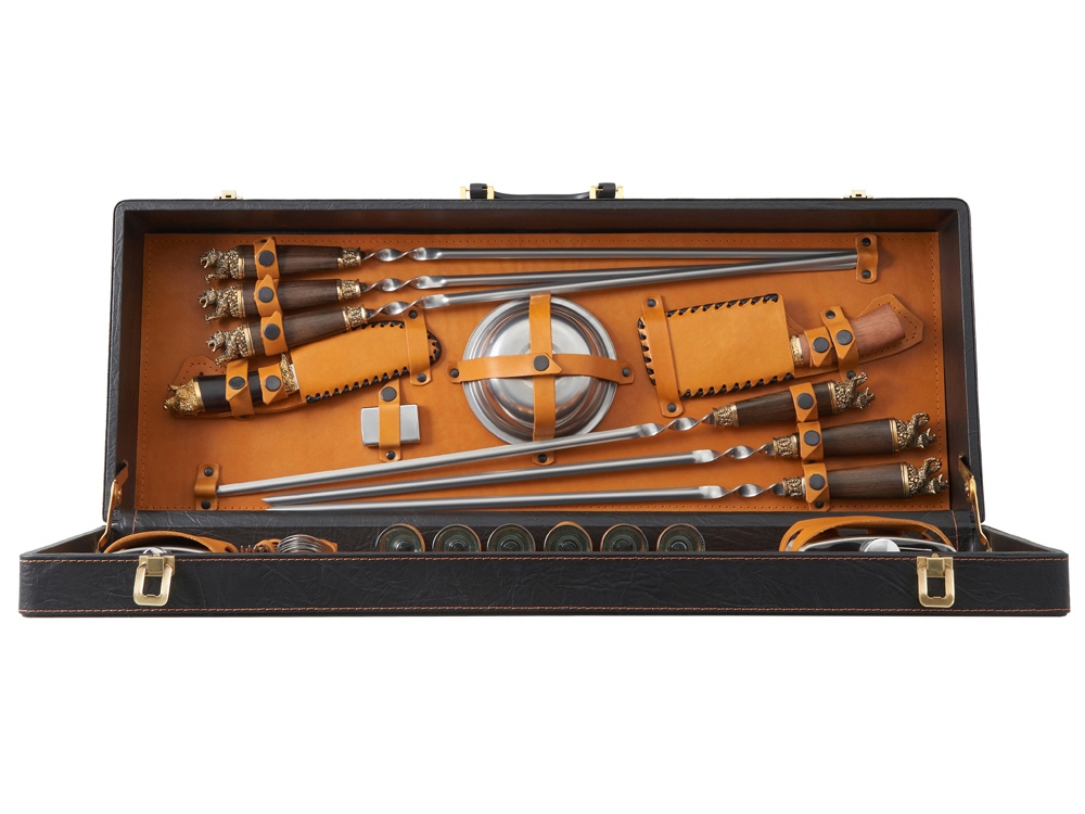 Комплектность: шампура большие- 6 шт, фляга большая, фляга малая, вилка- 6 шт, ложка- 6 шт, стопка- 6 шт, нож Тяпка, нож разделочный, зажигалка, тарелка- 6 шт