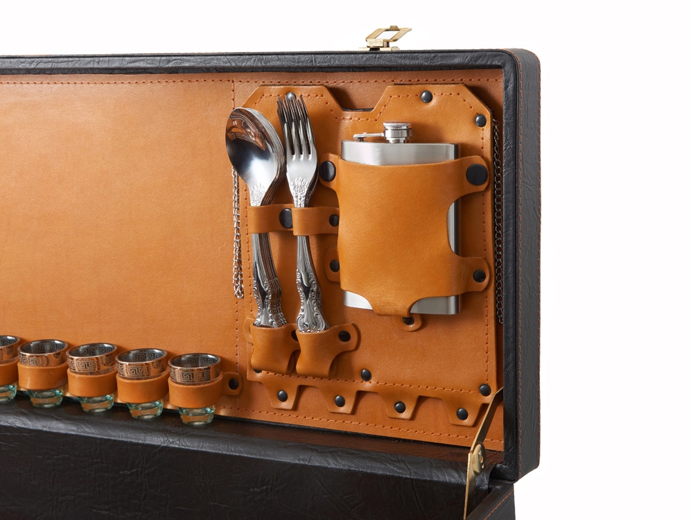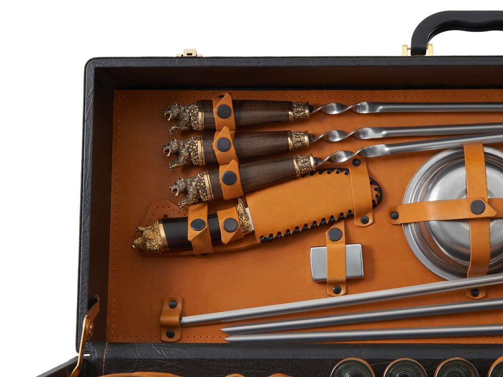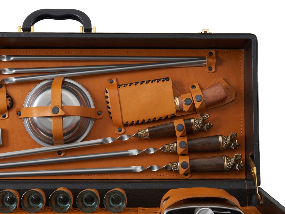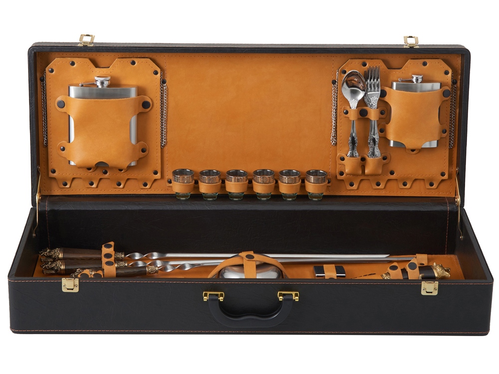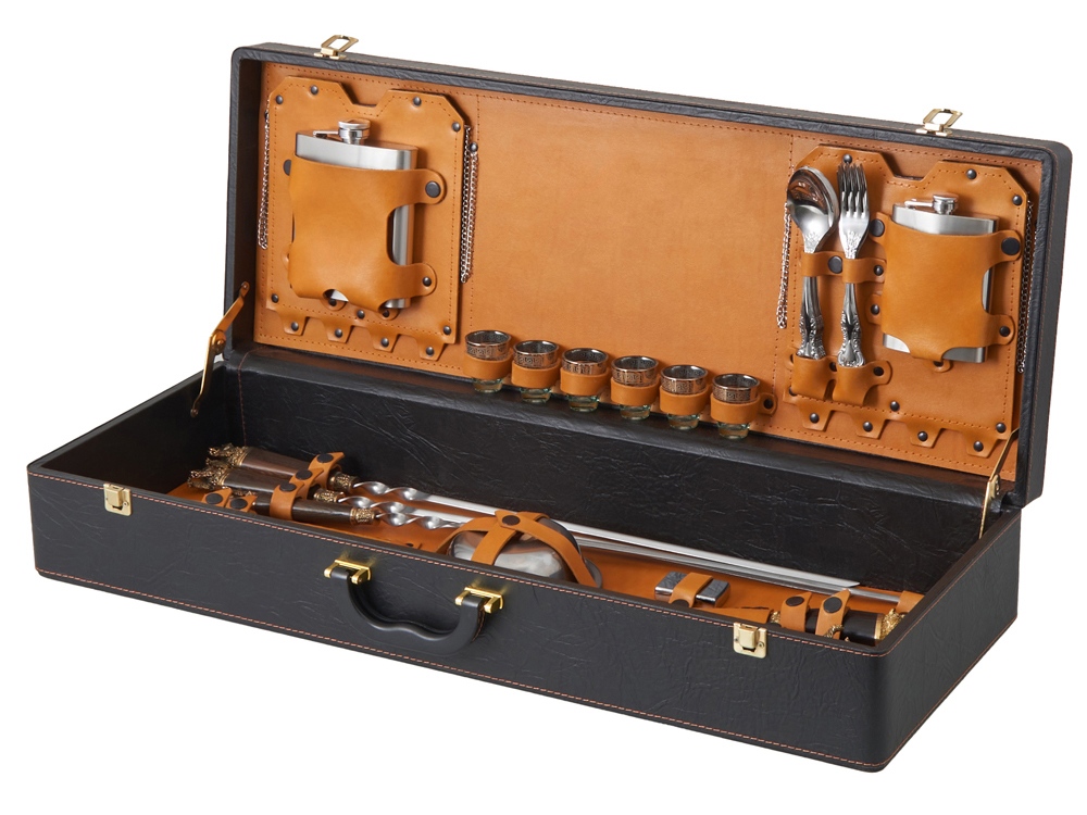Кейс из сплит-кожи, с повышенной износостойкостью, внутренняя отделка натуральная кожа. Все аксессуары надежно крепятся к кейсу кожаными ремешками на кнопке, обеспечивая удобство транспортировки и сохранность содержимого. В комплект входит: - шампура большие- 6 шт - фляга 500 мл - фляга 250 мл - тарелка- 6 шт - вилка- 6 шт - ложка- 6 шт - стопка 25 мл- 6 шт - нож Тяпка - нож разделочный - зажигалка
