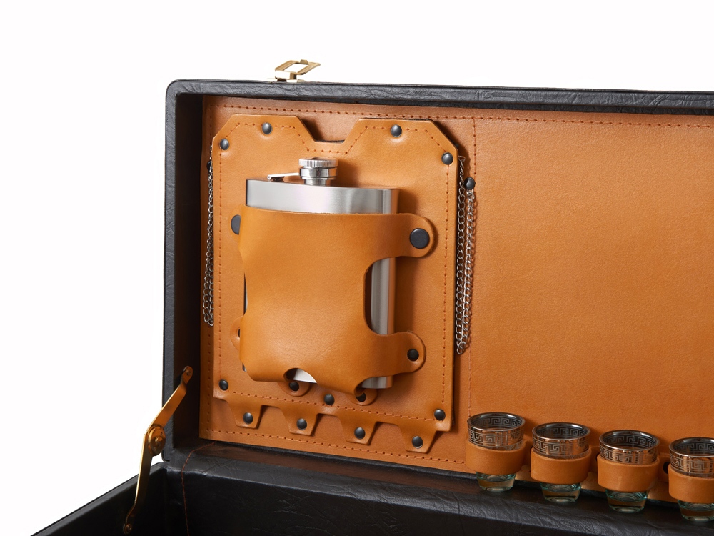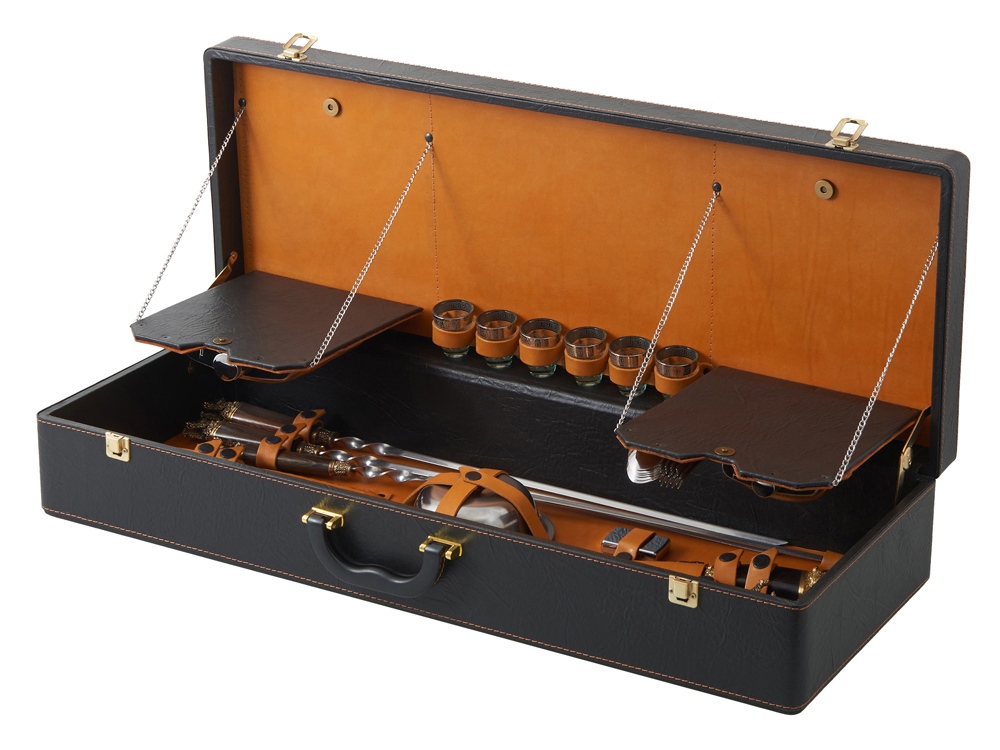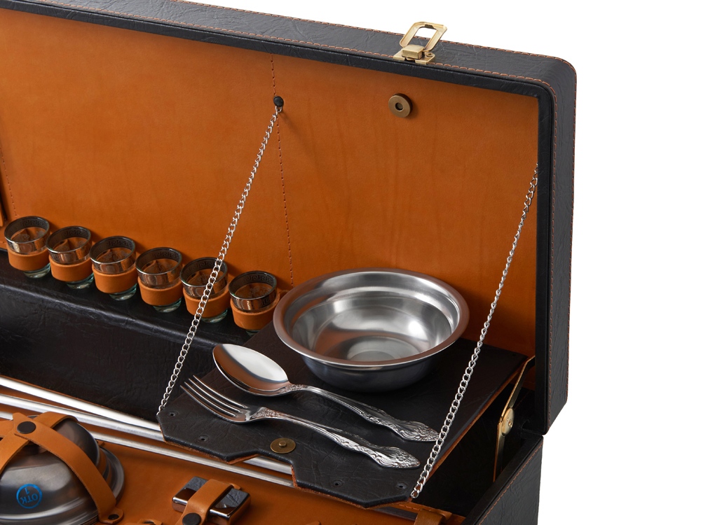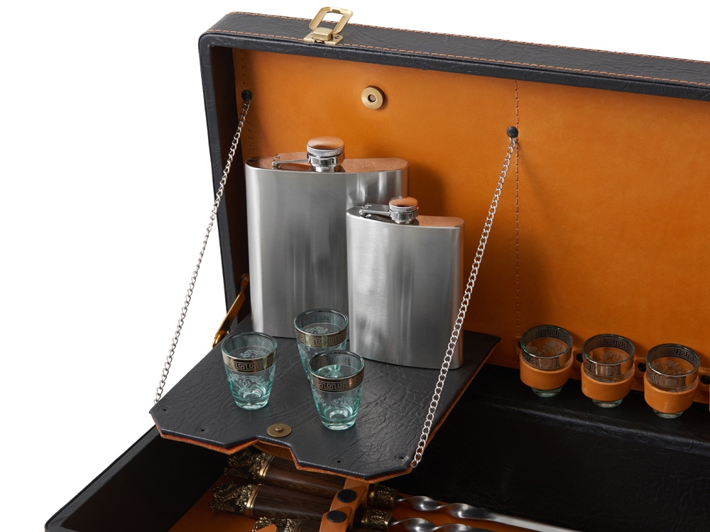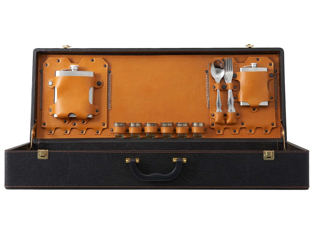 Кейс из сплит-кожи, с повышенной износостойкостью, внутренняя отделка натуральная кожа. Все аксессуары надежно крепятся к кейсу кожаными ремешками на кнопке, обеспечивая удобство транспортировки и сохранность содержимого. В комплект входит: - шампура большие- 6 шт - фляга 500 мл - фляга 250 мл - тарелка- 6 шт - вилка- 6 шт - ложка- 6 шт - стопка 25 мл- 6 шт - нож Тяпка - нож разделочный - зажигалка
