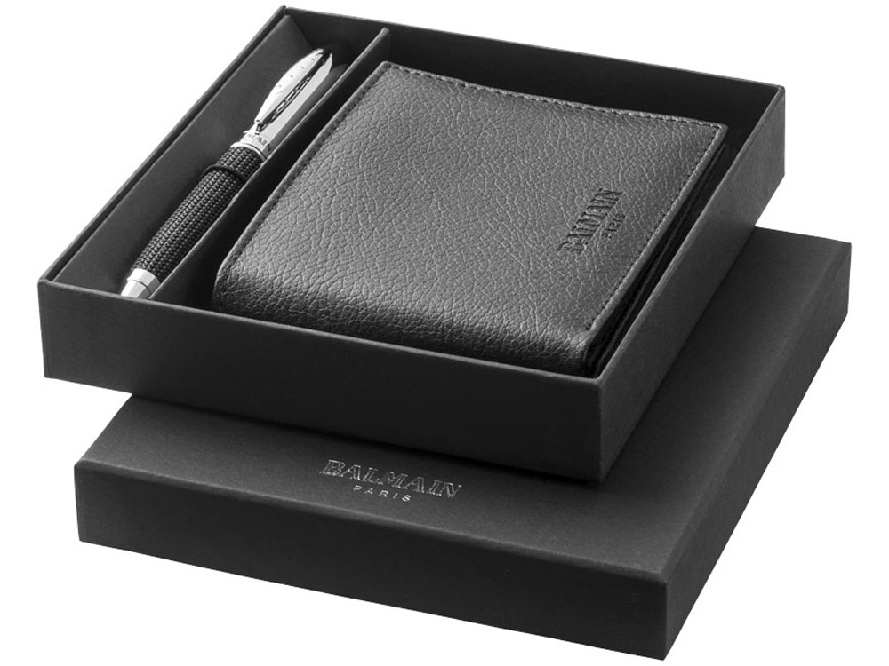 Два необходимых предмета в одном стильном подарочном наборе- шариковая ручка с кожаным покрытием и бумажник. Эксклюзивный дизайн.