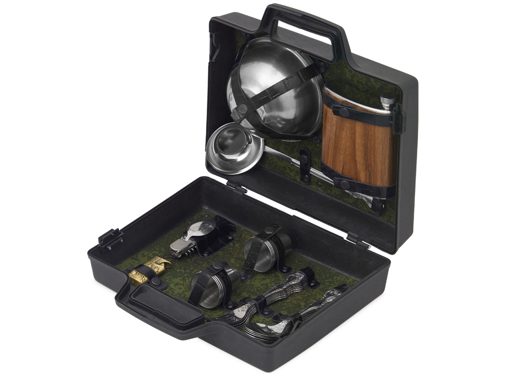 Все элементы набора выполнены из качественной нержавеющей стали, что обеспечивает долговечность и легкость в уходе. Упакованы в пластиковый кейс и надежно закреплены ремешками из натуральной кожи, что обеспечивает удобство транспортировки и сохранность содержимого.