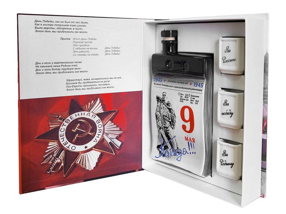 Сувениры изготовлены из высококачественной керамики и упакованы в подарочную коробку с изображением главных символов праздника. В комплекте идет штоф в виде календаря и три стопки с патриотическими тостами За Россию, За Родину”, За победу”. Этот подарочный набор станет прекрасным дополнением к праздничному столу.