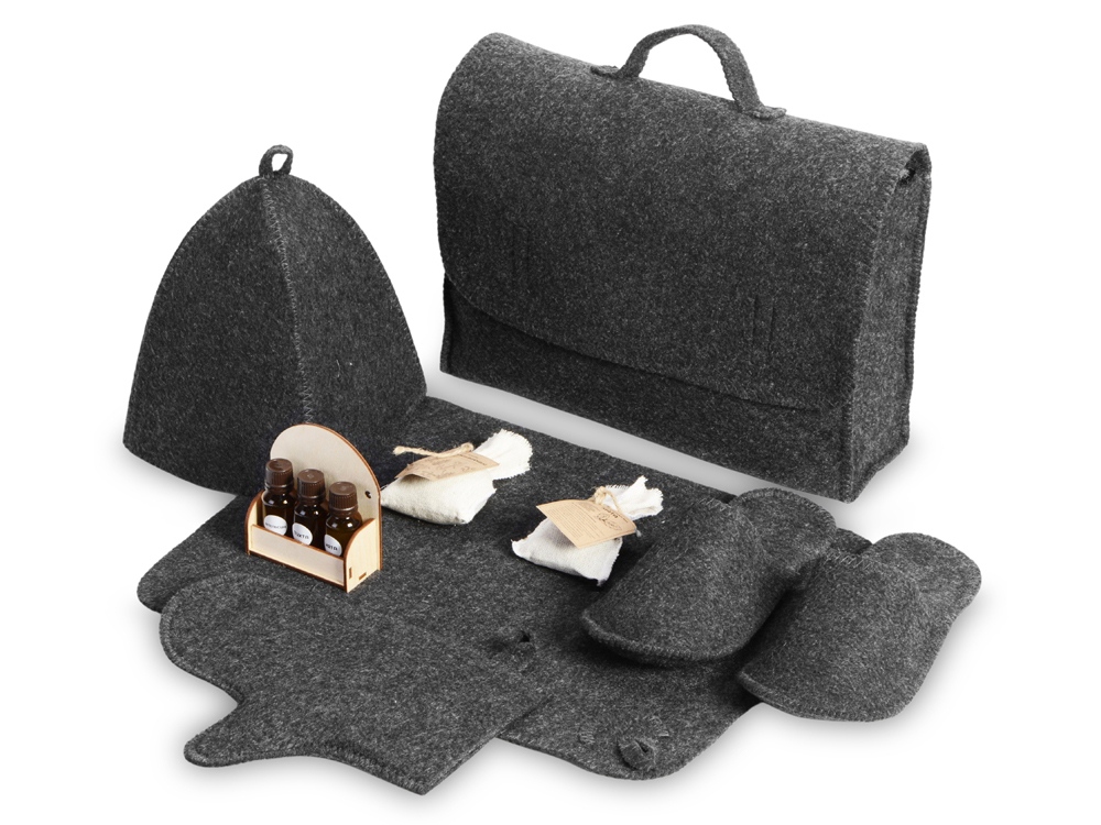 Комплектность: портфель, шапка, коврик, варежка, тапочки, запарка (мята 30гр, фитосбор 30гр), масло 3 шт на деревянной подставке, (мята, апельсин, пихта по 15мл)