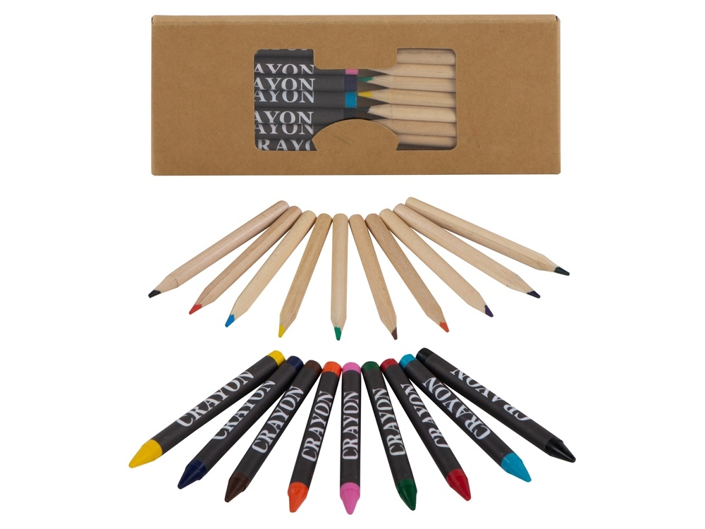 10 цветных карандашей, 9 восковых мелков;