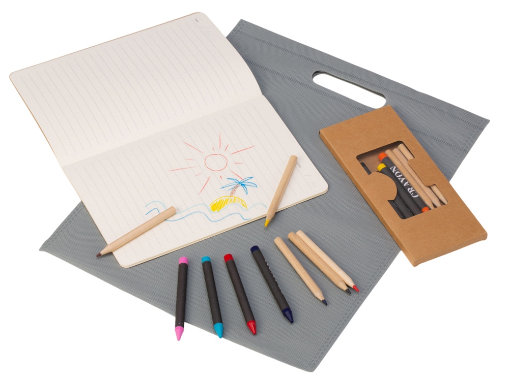 Набор из блокнота и цветных карандашей отлично подойдёт для детского промо-сувенира.