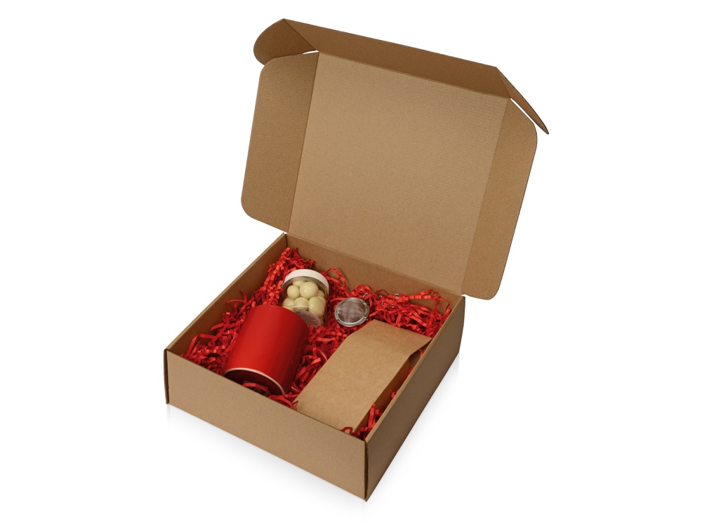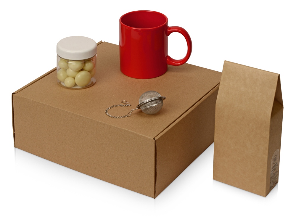 Набор состоит из кружки, ягод малины в йогуртовой глазури, фруктового чая, ситечка для заварки. Набор упакован в крафтовую картонную коробку с бумажным наполнителем.