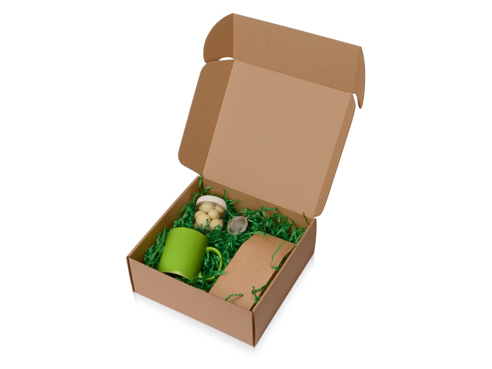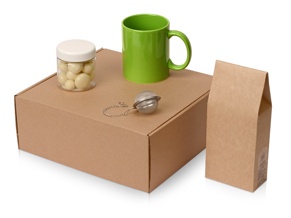Набор состоит из кружки, ягод малины в йогуртовой глазури, фруктового чая, ситечка для заварки. Набор упакован в крафтовую картонную коробку с бумажным наполнителем.