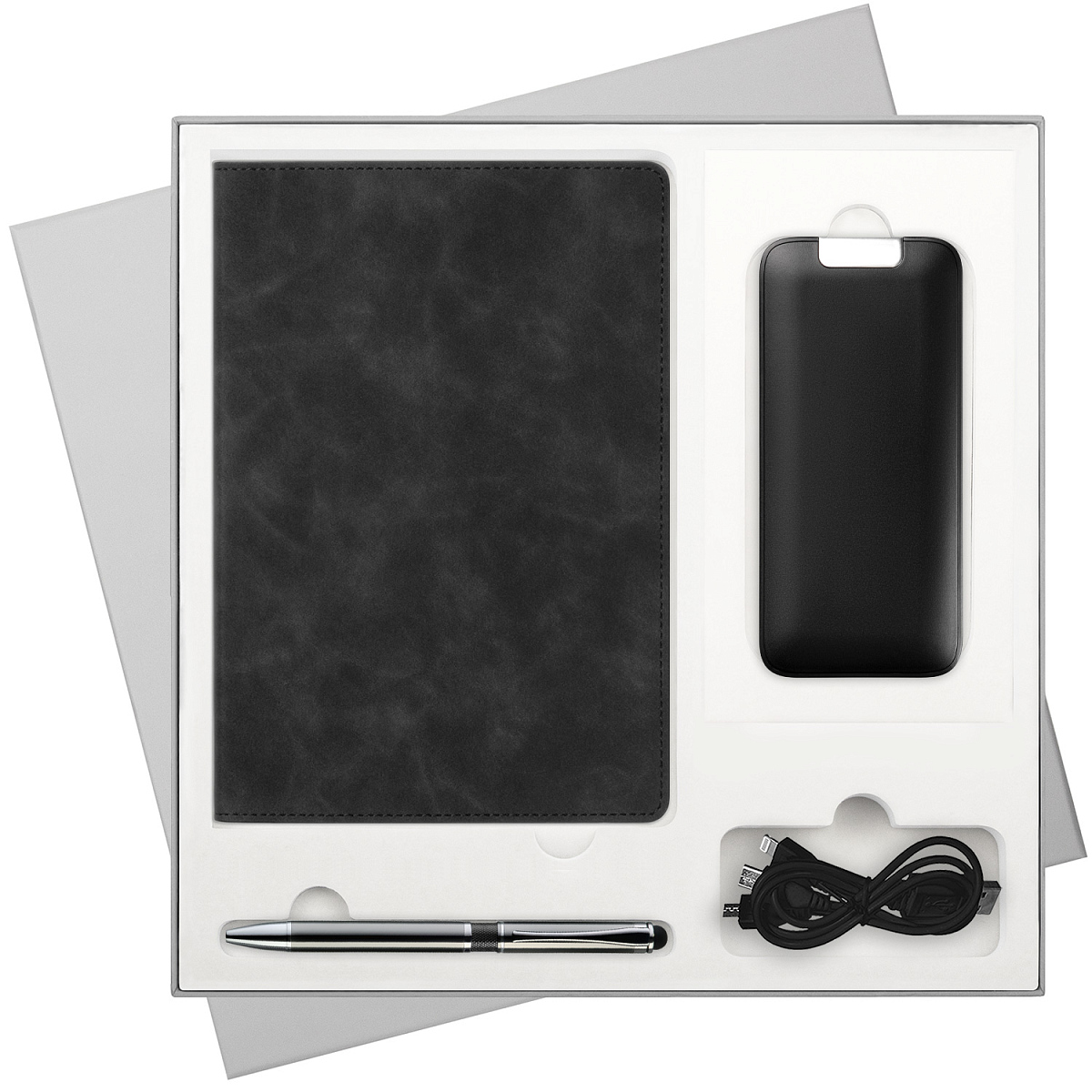 В комплекте: стильный ежедневник для планирования и любых записей, ручка для комфортного письма и внешний аккумулятор, который позволит оставаться на связи в любой ситуации.