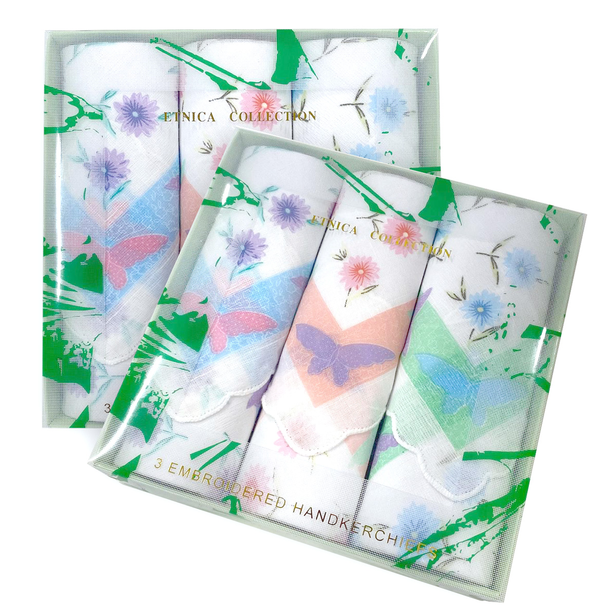 Нежный подарочный набор женских носовых платков ETNICA COLLECTION. В наборе 3 платка из натурального 100% хлопка с волнистым краем. Набор отгружаются в ассортименте.