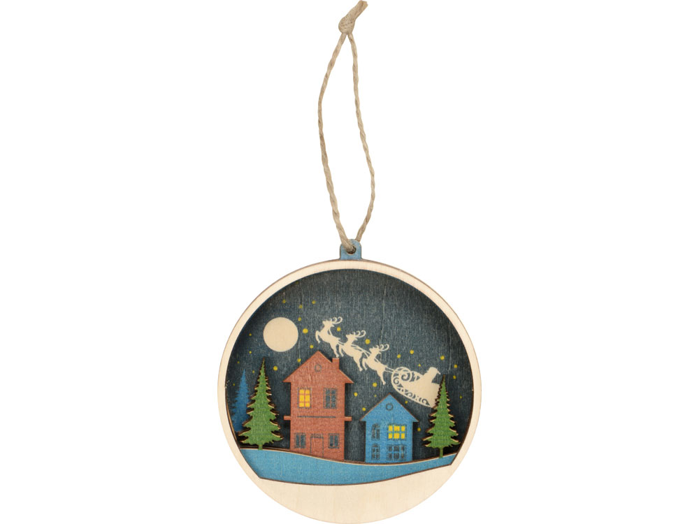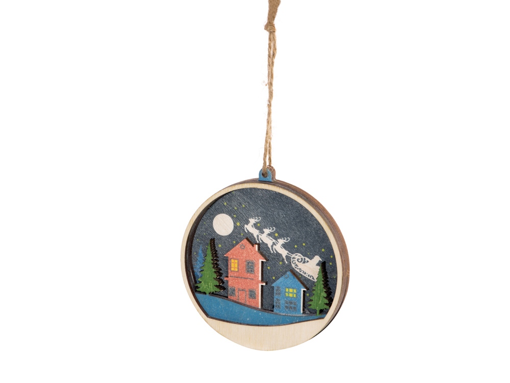 Новогодняя игрушка выполнена из трех слоев фанеры, домики, небо и елочки, изображенные на ней, расположены на разных уровнях, что позволяет создать выпуклый рельеф. Весь зимний пейзаж выглядит объемно, создавая праздничное настроение.