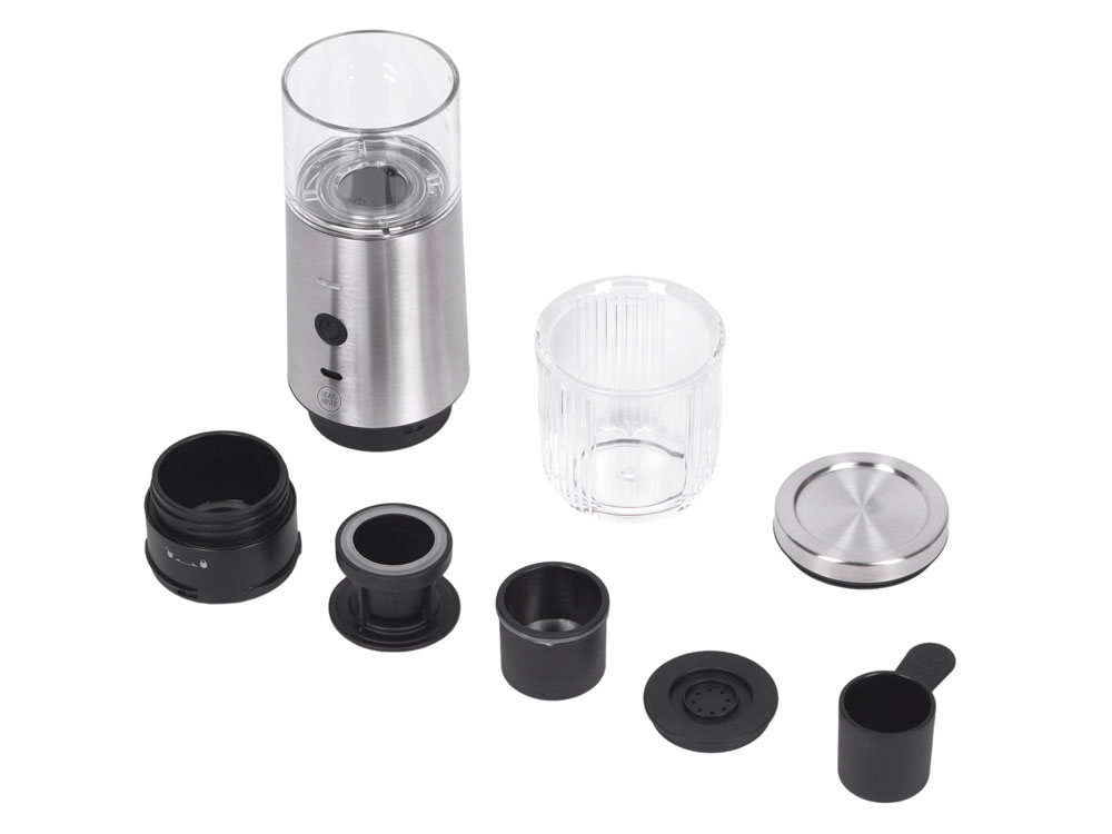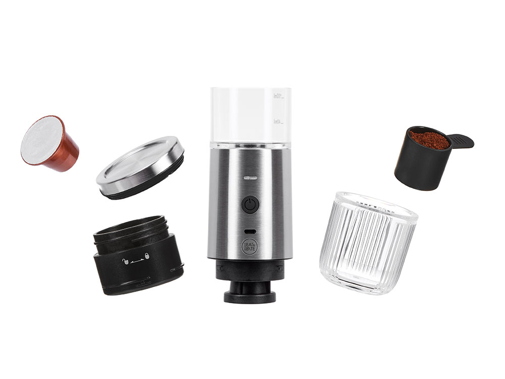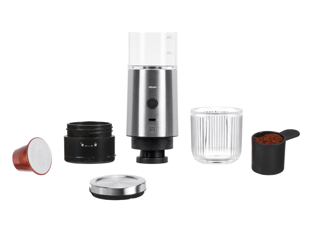 Комплектность: устройство, съемная батарея, кабель USB-Type C, фильтры для капсульного и молотого кофе, инструкция
