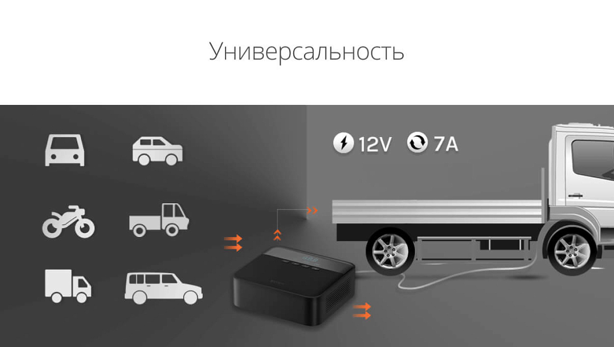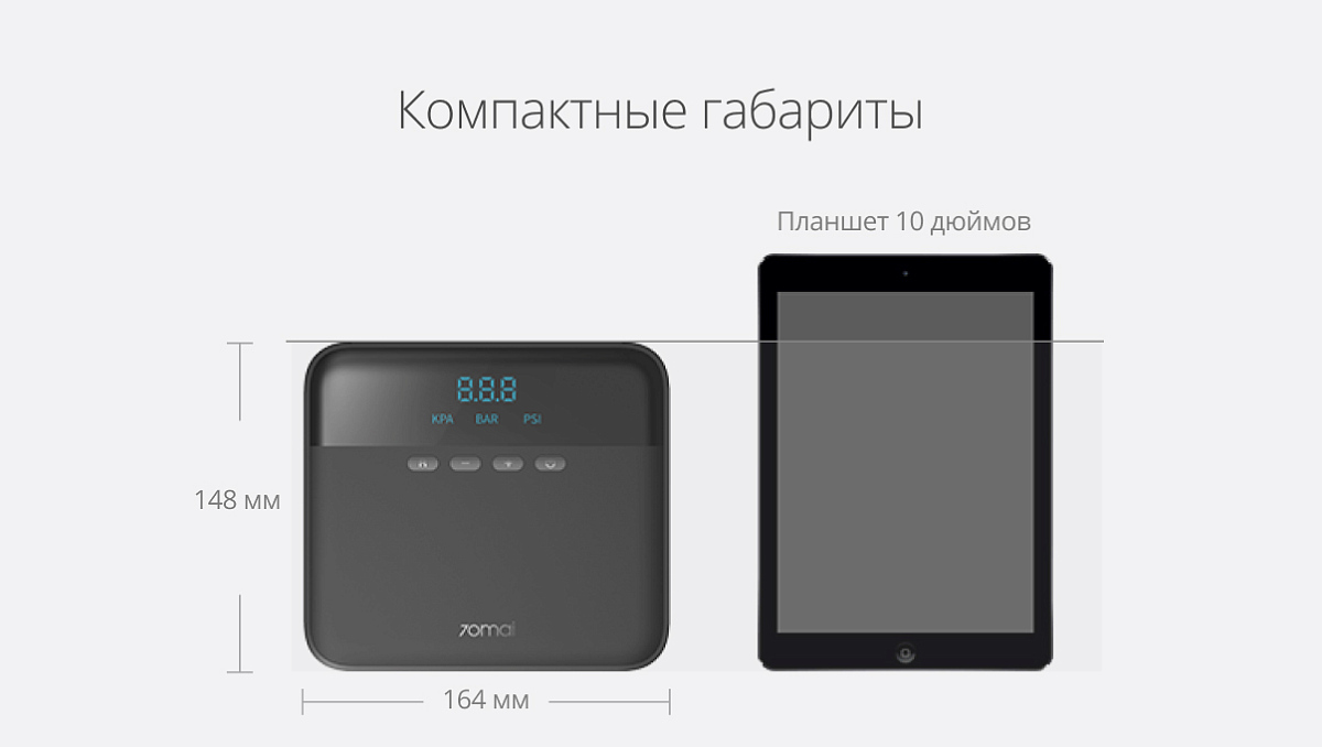 Особенности: несмотря на компактный корпус, компрессор 70Mai каждую секунду выдает 420 мл воздуха, а для полной накачки пустой автомобильной шины ему нужно всего 5 минут; множество насадок помогут накачать любой предмет, который нуждается в подкачке; выставляйте нужное значение и компрессор его запомнит