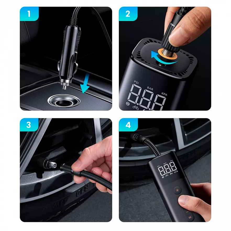 Особенности: воздушный поток до 30 л/мин и максимальное давление 150 PSI; интеллектуальный интерфейс; автоматическая защита от перекачки; защита от перегрева; многофункциональное освещение; подходит для автомобилей, мотоциклов, велосипедов, а также мячей и других надувных предметов;