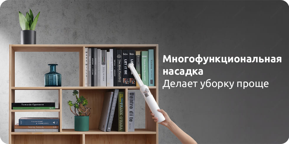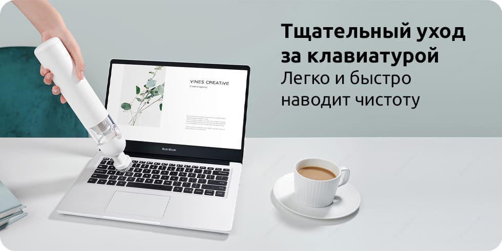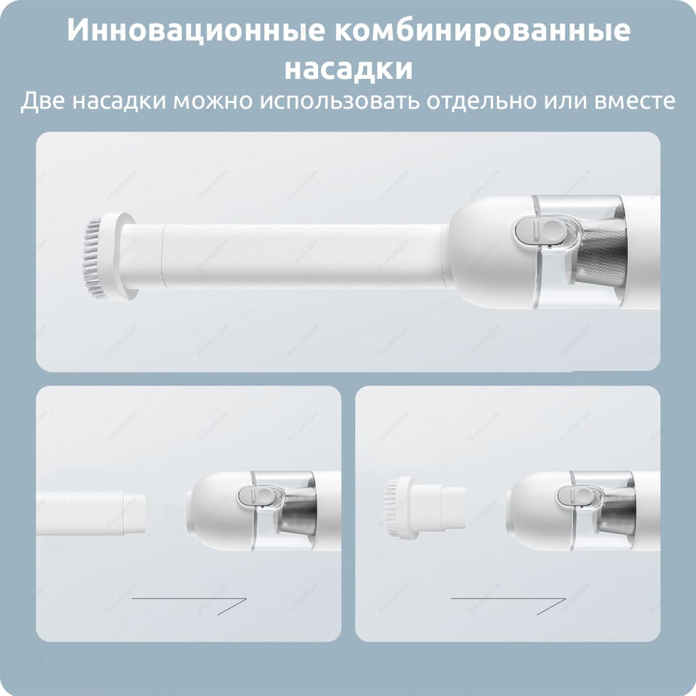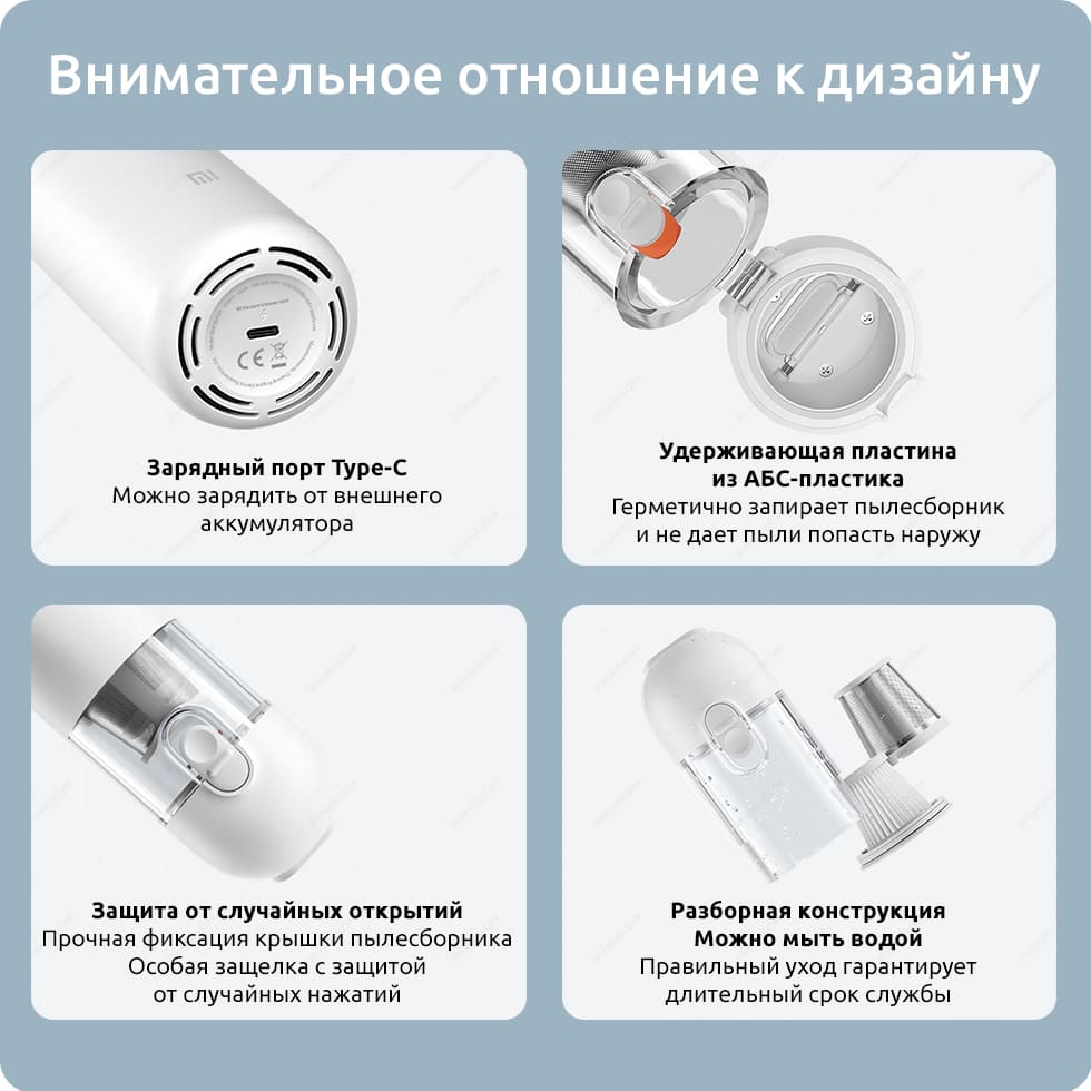 Комплектация: портативный пылесос, насадка с щеткой, плоская насадка, кабель для зарядки Type-C, адаптер питания