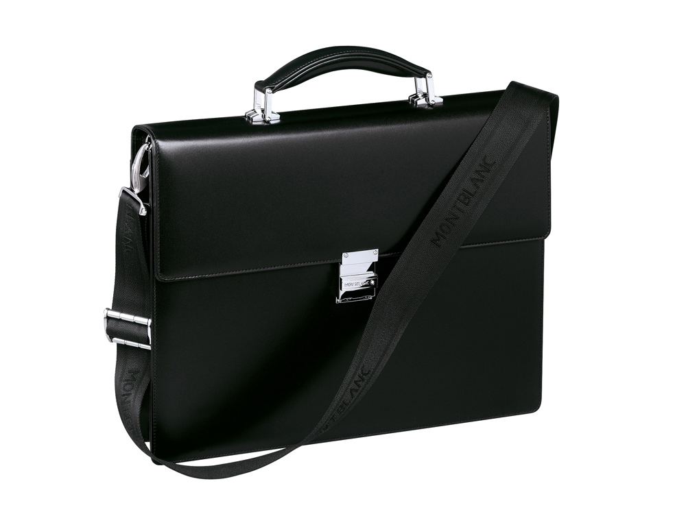 Портфель с одним отделением и съемным плечевым ремнем, изготовленный из зернистой яловичной кожи, подкладка из жаккарда с надписью Montblanc, фурнитура из нержавеющей стали, кодовый замок, эмблема Montblanc. Внутреннее отделение: Отделения для мобильного телефона (размер Blackberry), 2-ух пишущих инструментов, 1 документа среднего размера и 6 документов небольшого размера, кольцо для ключей.