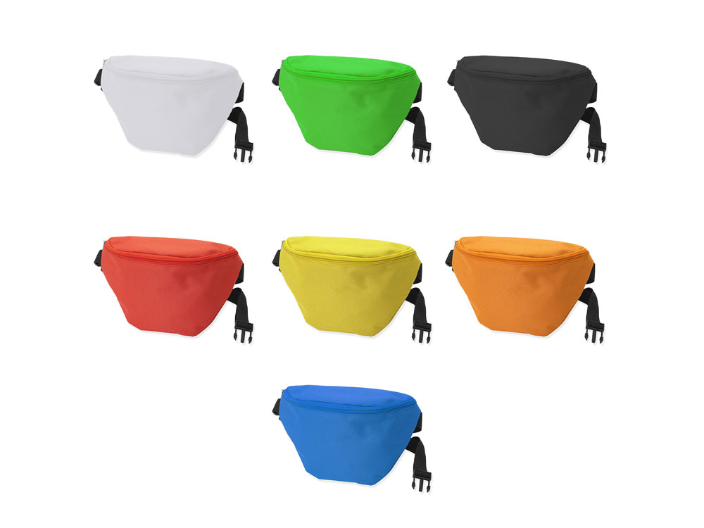 Поясная сумка с передним и задним карманом. Цветные молнии и ручки в тон поясной сумке. Черный ремешок и регулируемая застежка.