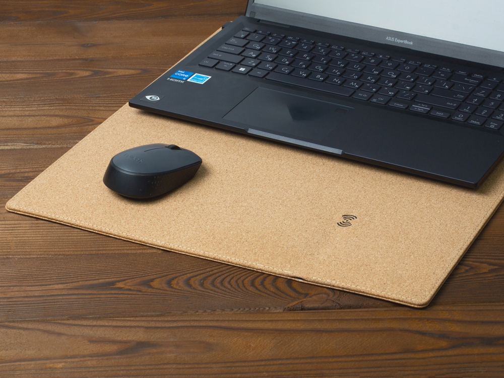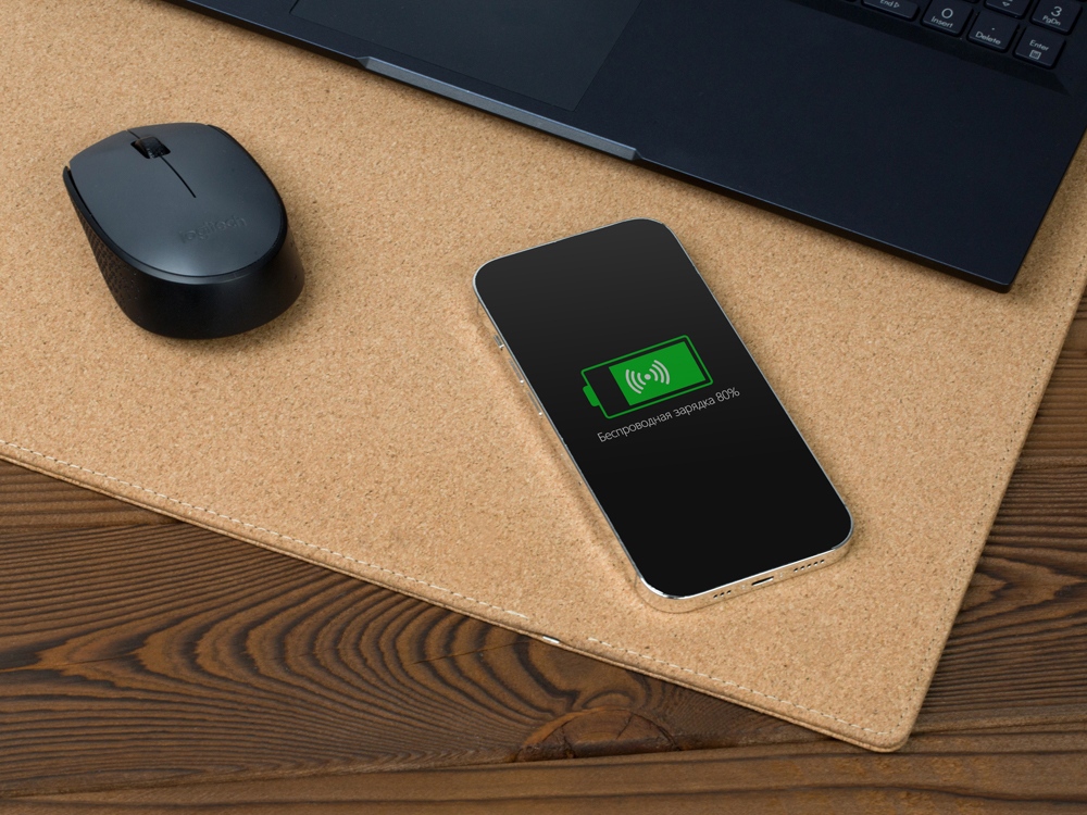 Большой (45 х 40 см) коврик из пробки для мышки, который может заряжать Qi-совместимые устройства методом беспроводной зарядки. Коврик позволяет разместить не только мышку, но и небольшой ноутбук или планшет. Коврик решает проблему скольжения мышки, обеспечивает бесшумное перемещение мыши по поверхности, позволяет декорировать интересным способом рабочее место. В комплекте длинный зарядный кабель 100 см. Коврик не складывается.