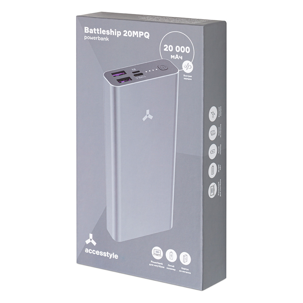 Особенности: Accesstyle Battleship 20MPQ – аккумулятор-монстр на 20 000 мАч с возможностью зарядки ноутбуков, быстрая зарядка смартфонов с поддержкой USB Power Delivery: примерно в 2 раза быстрее, чем от power-bank без 18-ваттного режима, одновременная подзарядка трёх устройств: два разъёма USB (оба с поддержкой «быстрой зарядки») и один USB Type-C, корпус из прочного авиационного алюминия – почти броня