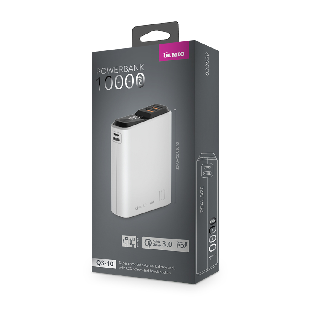 Особенности: LED дисплей с цифровым индикатором остатка заряда, Olmio QS-10 поддерживает быструю зарядку Quick Charge 3.0 на вход и выход, функция Power Delivery с помощью которой пауэрбанк QS-10 может передавать через разъем Type-C ток с максимальной выходной мощностью 18 Ватт, что соответствует требованиям мощных современных смартфонов и даже некоторых ноутбуков