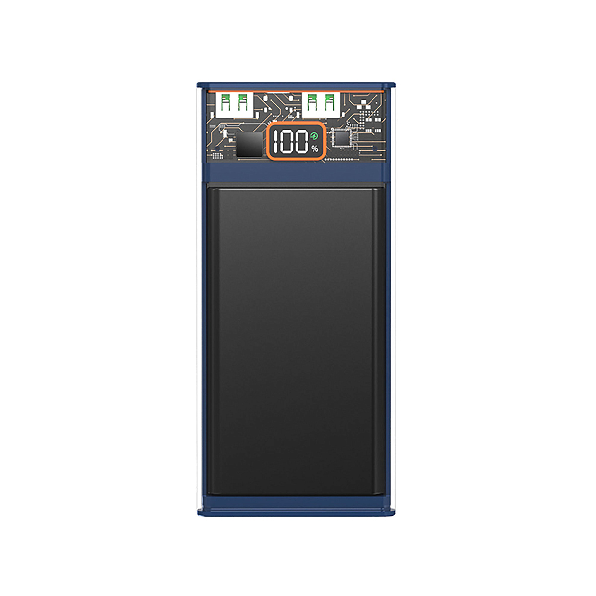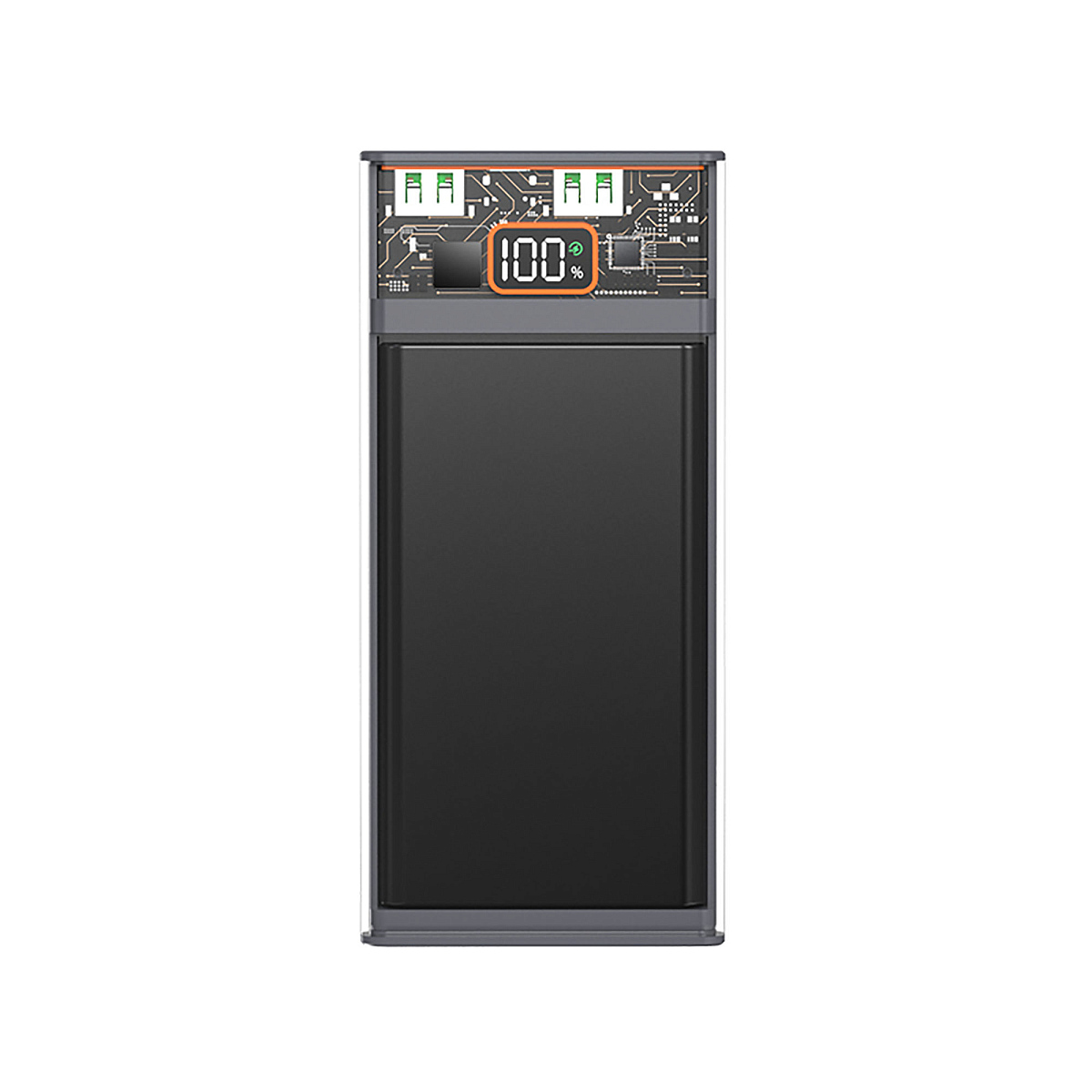 Особенности: прозрачный дизайн; быстрая зарядка по протоколу Power Delivery и Quick Charge; прозрачный дизайн; цифровой LCD дисплей отображает процент заряда батареи; зарядка нескольких устройств одновременно через порты USB и Type-C