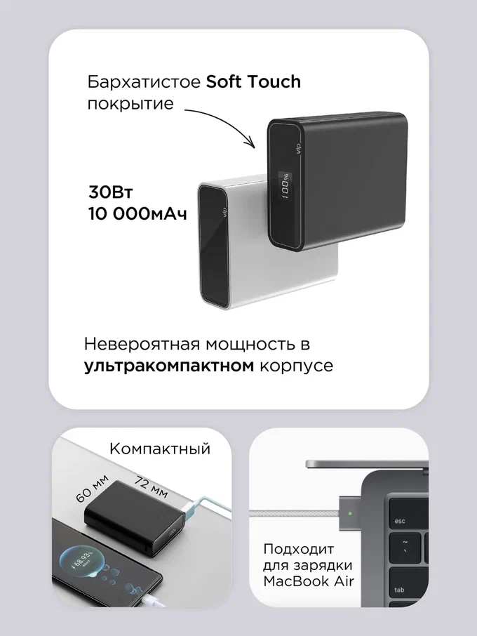Особенности: невероятная мощность 30 Вт в самом компактном корпусе за всю историю; LED индикация заряда (для показа уровня заряда просто потрясите павербанк); защита от перегрева и короткого замыкания;поддержка PD 4.0/QC 3.0
