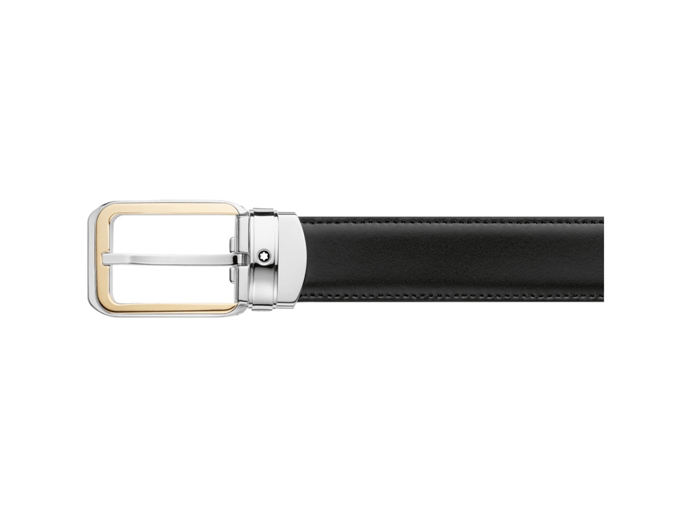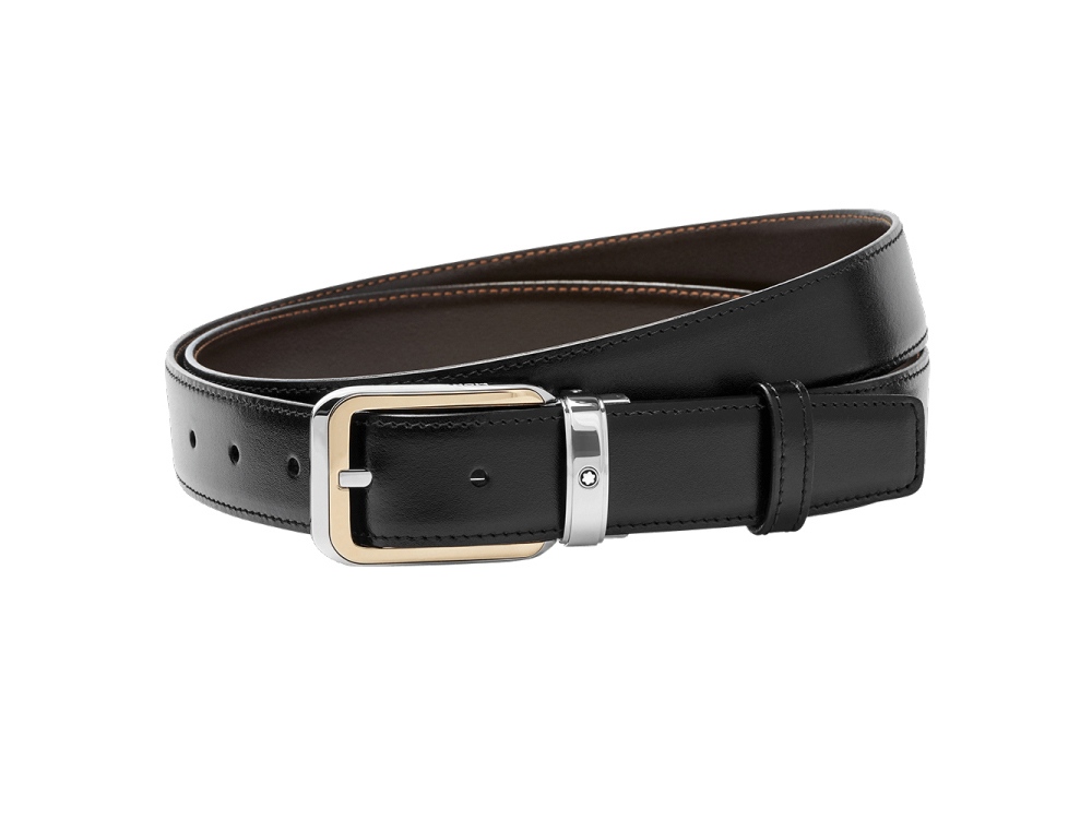 Стандартная пряжка прямоугольной формы из нержавеющей стали с полированной отделкой и PVD-покрытием цвета желтого золота; система регулировки длины ремня; 3 x 120 см; двусторонний черный/коричневый ремень из кожи.