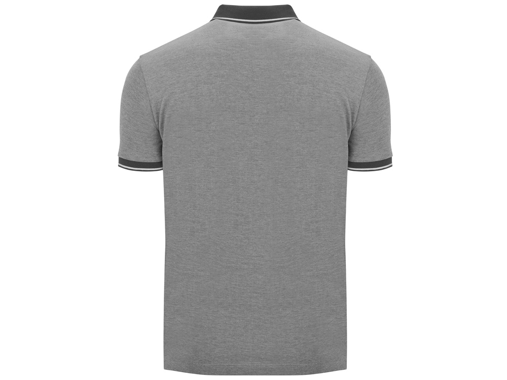 Рубашка поло с коротким рукавом. Манжеты и воротник из однотонного риба 1х1 с контрастными полосками. Планка на 3 пуговицы. Низ с боковыми разрезами, отделанными тесьмой. Спинка немного длиннее полочки. Полотно с меланжевым эффектом.