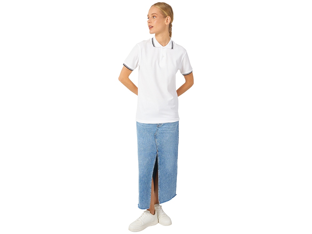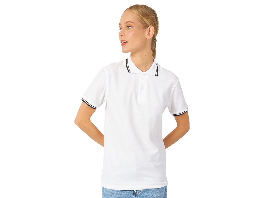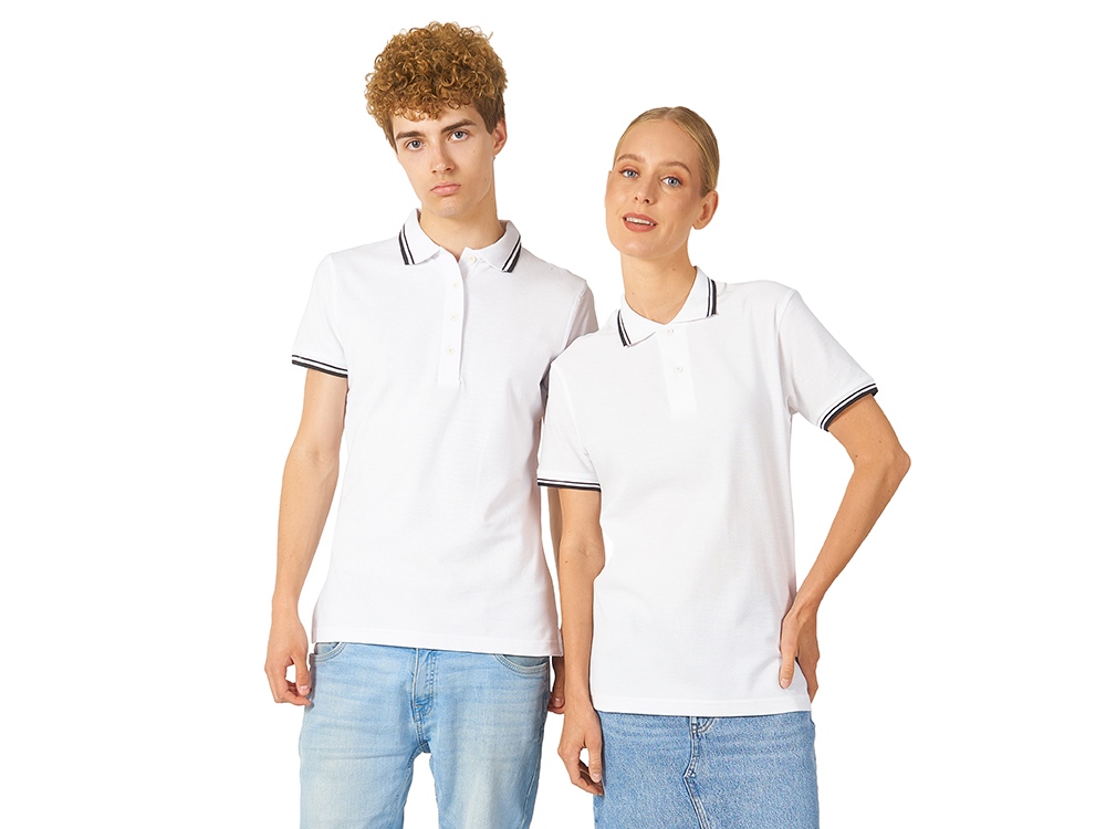 Рубашка-поло Erie с окантовкой. Воротник и манжеты резинка 1х1. Мужская модель с двумя пуговицами, женская - 4 пуговицы в тон изделия. Обшивка внутри воротника. Женская модель с разрезами по бокам. Женская модель приталена. Пике, 100% чесаный хлопок. Плотность 180 г/м2.