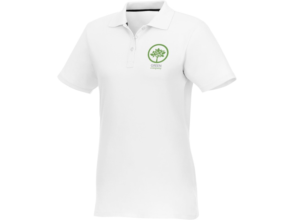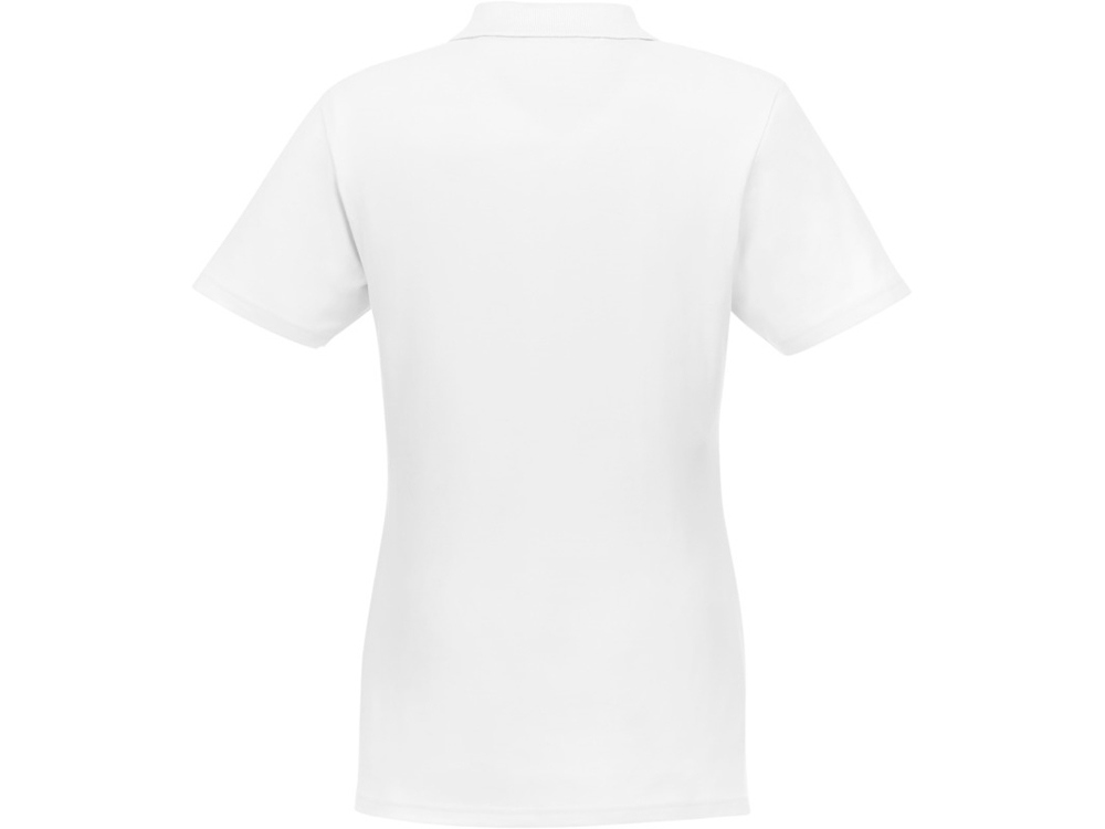 Женское поло Helios с коротким рукавом. Женская модель с разрезами по бокам. Отрезной-отрывной ярлык для комфорта. Воротник гладкой вязкой в рубчик. Планка с тремя пуговицами. Двойная строчка на воротнике и внизу изделия. Пуговицы в цвет изделия. Полоска на горловине в контрастном цвете. Трикотаж Piqué, 100 % хлопок. 180 г/м².