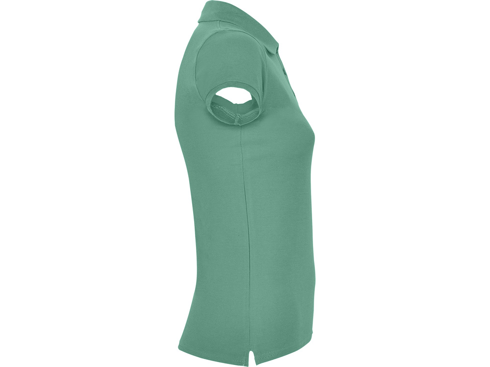 Поло с коротким рукавом для женщин приталенного силуэта. Воротник и манжеты из риба 1х1, отделка горловины внутри тесьмой. Элегантная планка застегивается на 3 пуговицы. Разрезы в боковых швах.