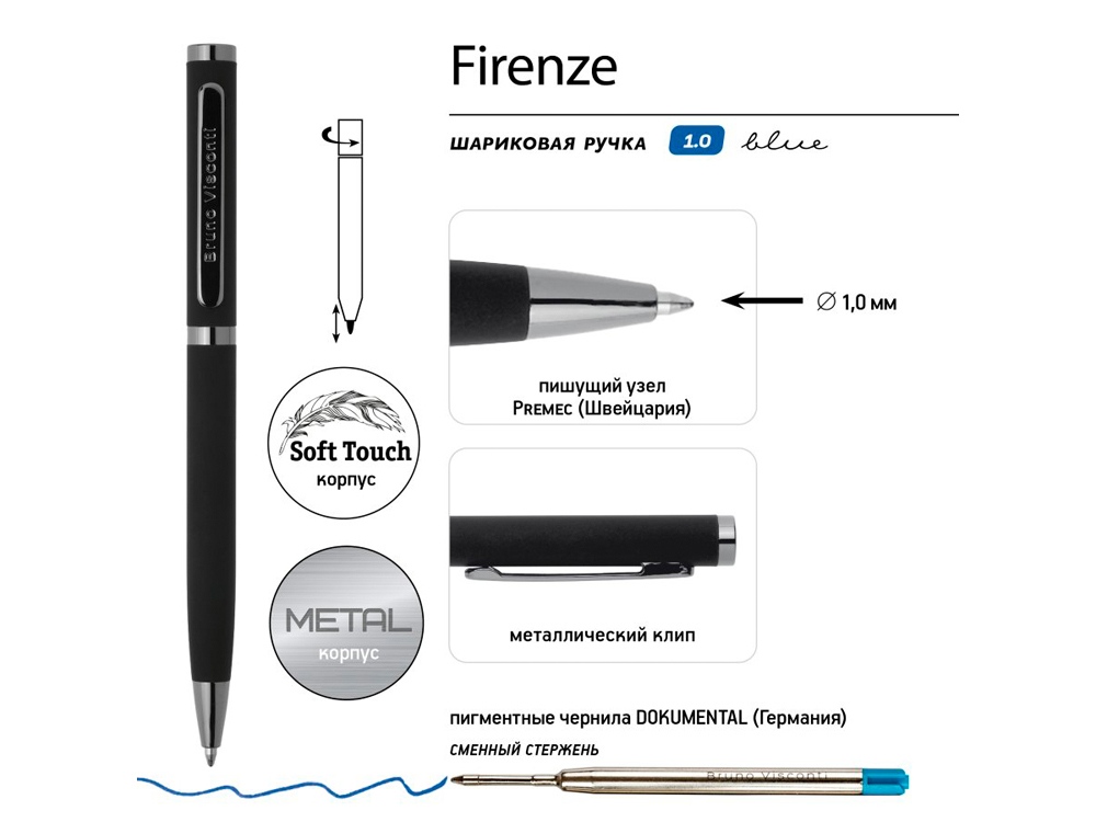 Ручка автоматическая, с легким поворотным механизмом подачи стержня. Надежный пишущий узел d 1,0 мм (от швейцарского производителя Premec) гарантирует высокое качество также, как и пигментные чернила Dokumental (Германия). Благодаря им писать ручкой Firenze одно удовольствие – она мягко скользит по поверхности бумаги, оставляя ровную, четкую линию.