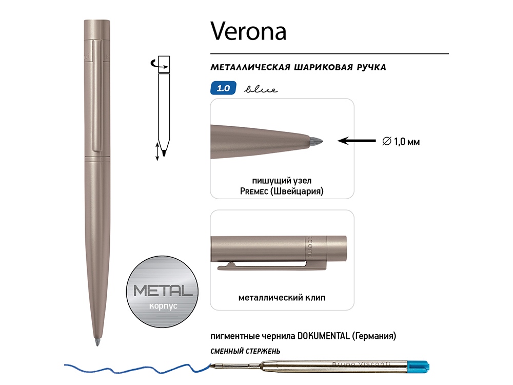 Как и все подарочные ручки Bruno Visconti, Verona - обладательница стержня с пишущим узлом от швейцарского производителя Premec и перманентными чернилами немецкого производителя Dokumental. Поэтому можно быть абсолютно уверенным в качестве письма.